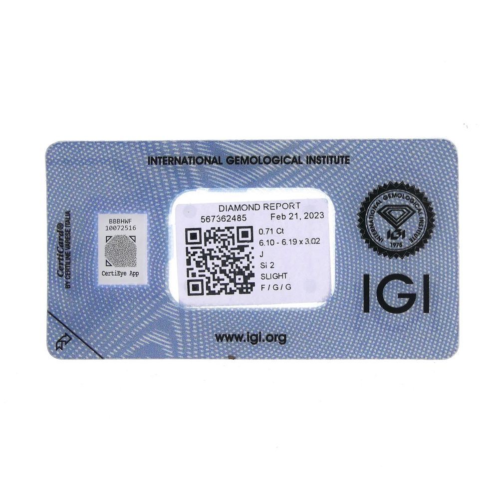 0.71 ct. Brilliant cut diamond; Color J; Quality SI2 + IGI Certificate
