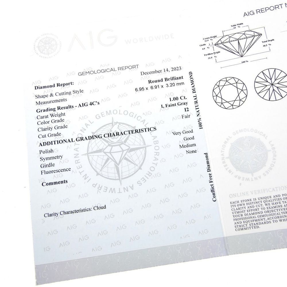 Loose 1.00 ct. brilliant-cut diamond with an official AIG Antwerp certificate. The certificate confirms its authenticity and describes all the characteristics of this specific diamond. By characteristics, we mean the 4 C's: carat, color, cut, and clarity. The diamond is sealed by AIG Antwerp, which acts as a mini ID card. You can find the diamond on the official AIG website using the report number. AIG Antwerp certificate I / I2 Cut: Brilliant Carat weight: 1.00 ct Fluorescence: None Color grade: Faint Gray (I) Clarity grade: I2 (Inclusions: 2)