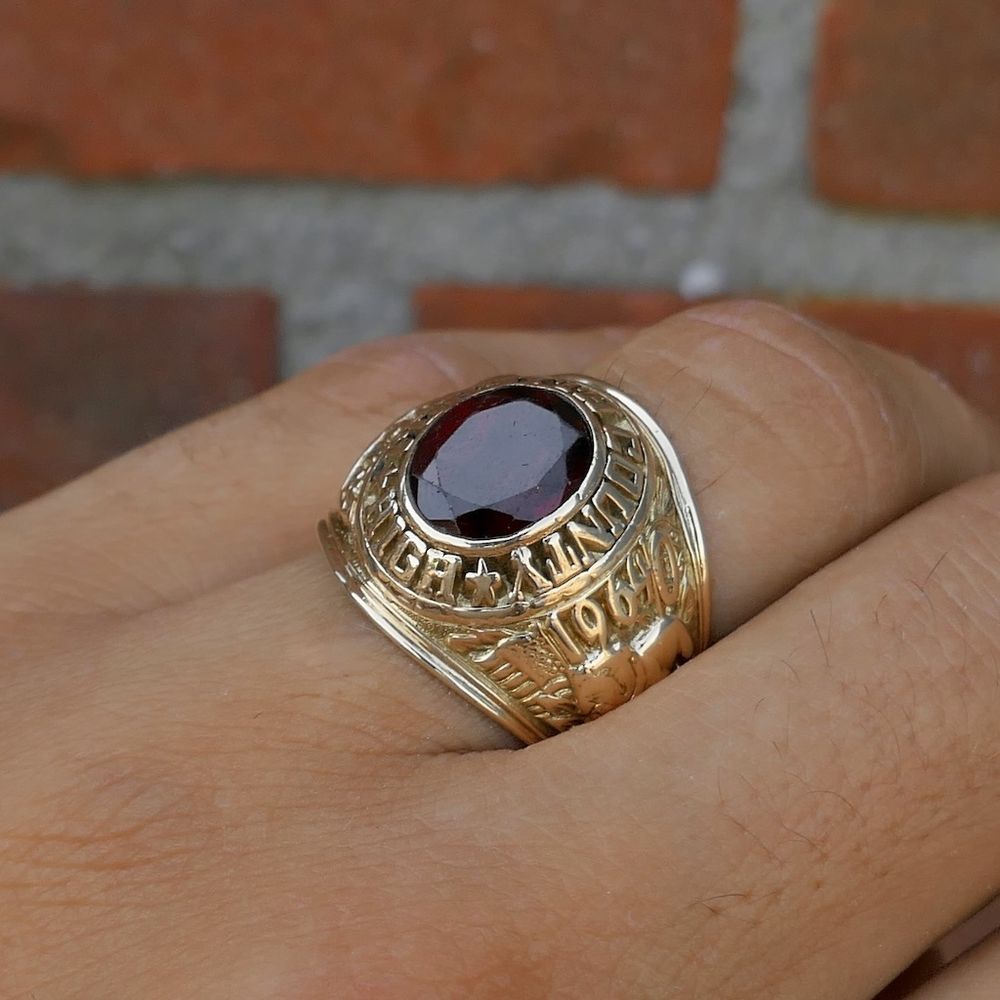 10-carat Forsyth County High School Class ring with garnet from Balfour. The garnet stone is oval-faceted. The sides of the ring are personalized for the wearer, representing their program of study. It also features the Bulldog emblem, representing the Georgia school's mascot. The 1964 graduation year is also engraved on the ring. This beautiful men's jewelry is crafted from 10 carats (416/1000). Ring size: 20.5 Garnet is best known for its dark red color and is found worldwide, particularly in India, Madagascar, Mozambique, and Tanzania. This gemstone has a rich history and was especially popular in the 1920s, with jewelry featuring garnet stones being particularly popular. Even further back in time, the Vikings gave garnets as grave goods, because they believed that these would light the way to Valhalla for the deceased.