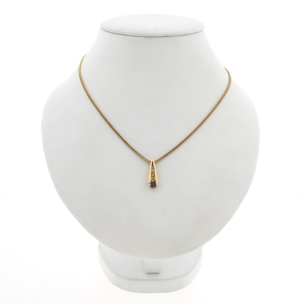 Gold pendant with a mix of gemstones. The pendant has a beautiful shimmer and stands out beautifully due to the colorful stones. The pendant is made from 10 karat yellow gold (416/1000).