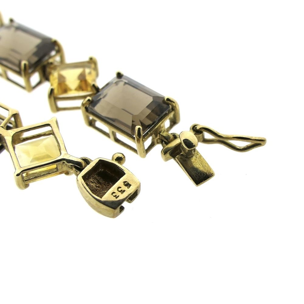 An 8-carat bracelet set alternately with square-cut citrine and square-cut smoky quartz. A stylish piece with a vintage look. The bracelet closes with a box clasp and safety hook and is made of 8 carats (333/1000).