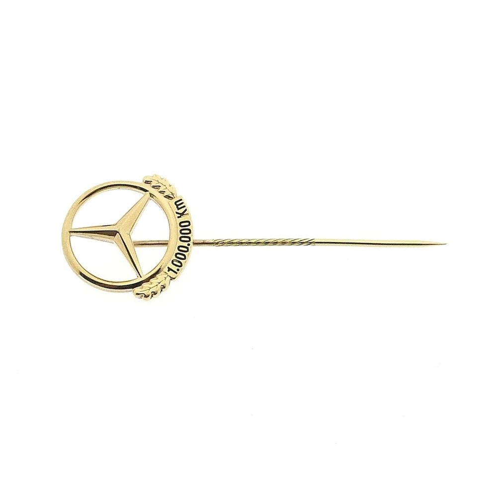 8-karat vintage lapel pin of a Mercedes-Benz logo with 1,000,000 km engraved. This lapel pin is worn on the lapel of a jacket. It's a beautiful antique piece that can certainly be worn again today. The pin is made of 8-karat (333/1000).