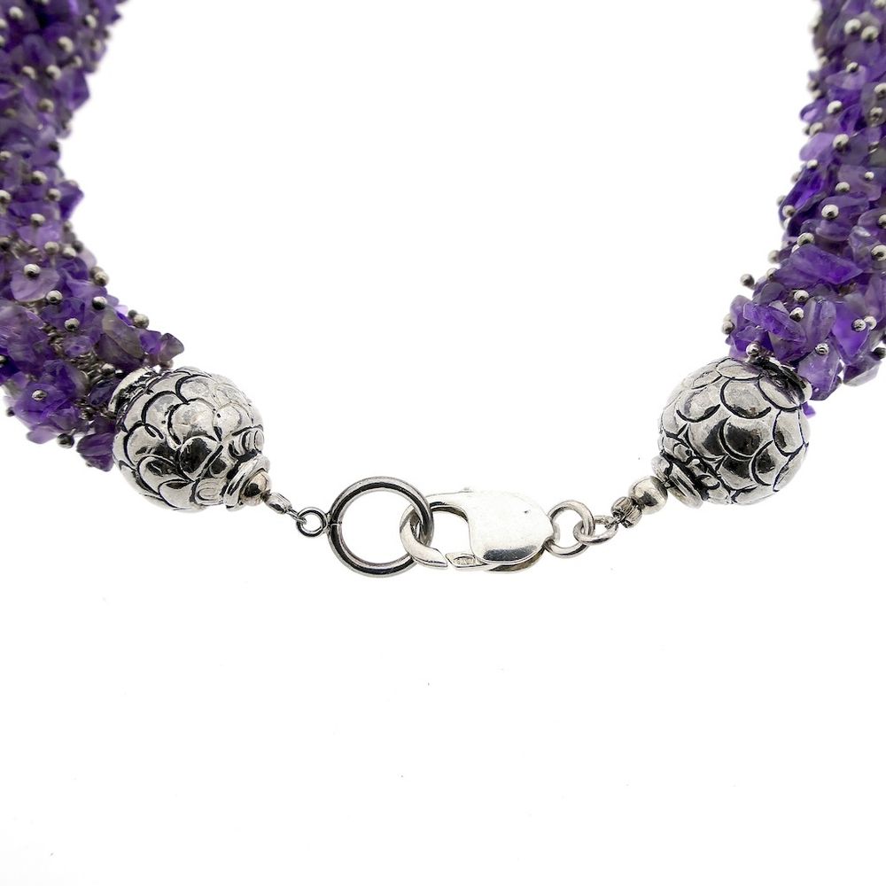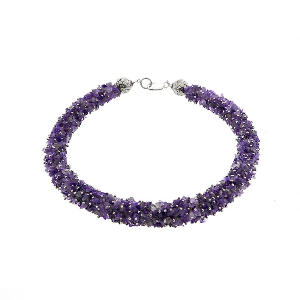 A unique necklace of silver and amethysts. The amethysts are strung on hundreds of silver pins. The stones are tumbled to prevent sharp edges and for a beautiful shine, but they are not cut and each has a different size and shape. The necklace is made of first-grade silver (925/1000).