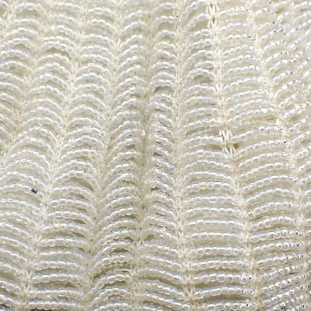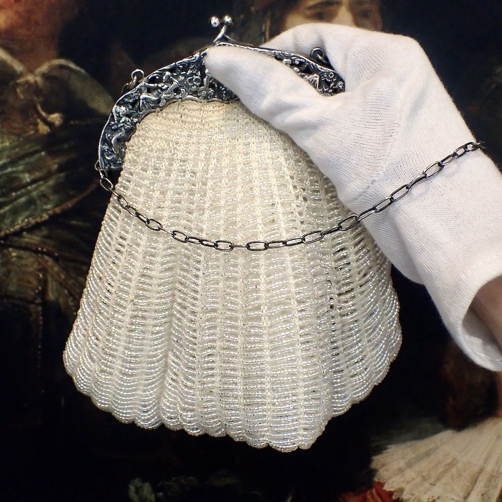 Antique clasp bag/handbag with a silver handle. The handle is beautifully detailed and made of sterling silver. The bag is made with clear glass beads with a pearlescent sheen, strung with creamy white thread. The interior has a glossy, creamy white cotton lining. The inside of the handle is engraved with the date 15-12-'24 and the initials H.B. It's wonderful to think that the bag carries a rich history.