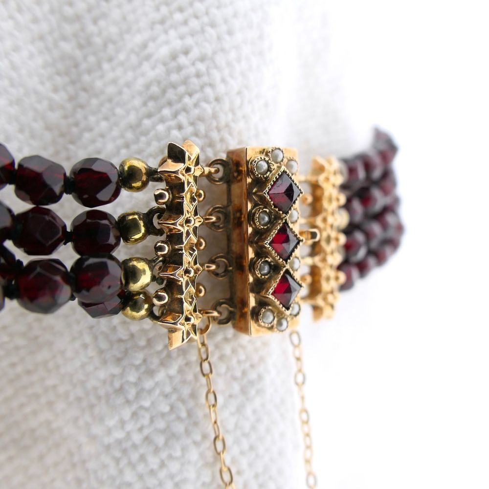 Antique garnet bead bracelet made of four strands. The beads are approximately 4.3 mm in diameter, faceted, and strung on a cord. The bracelet has a decorative clasp decorated with three garnet stones and small cultured pearls, and a safety chain. The piece is crafted from 14-karat yellow gold (585/1000).