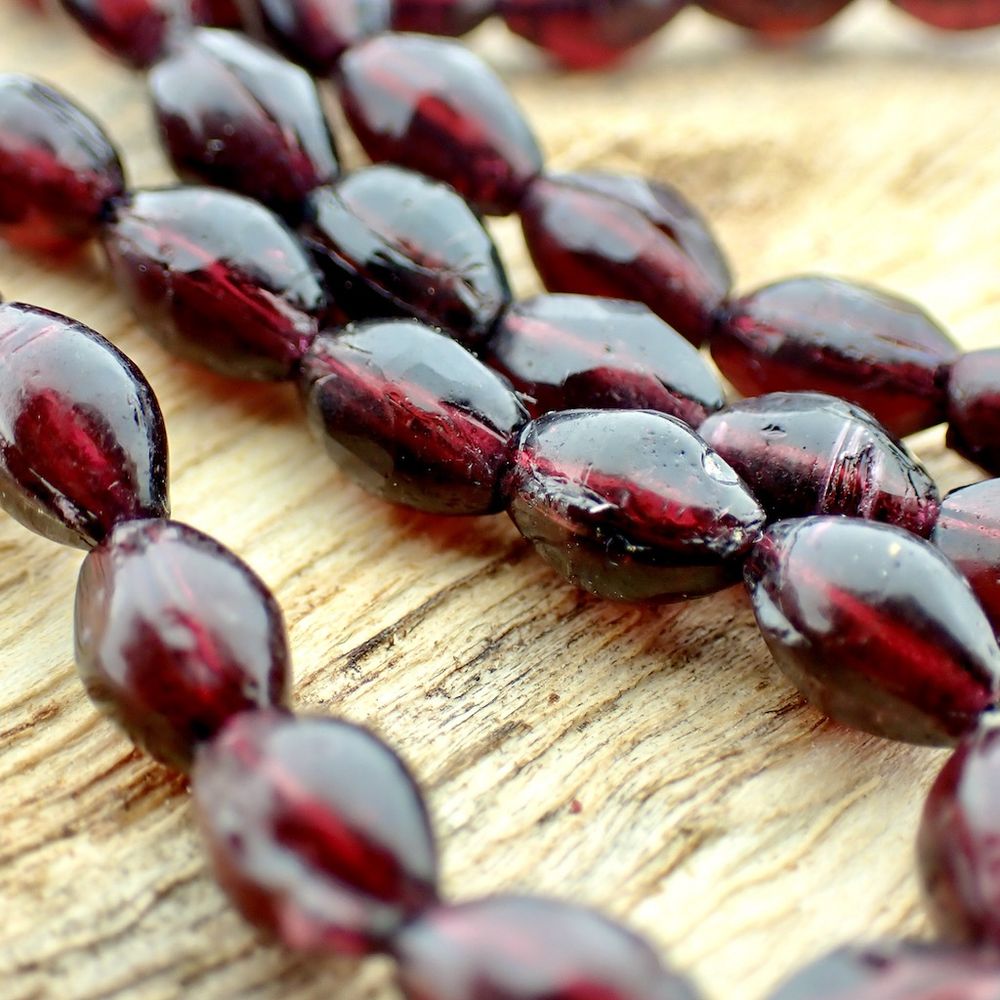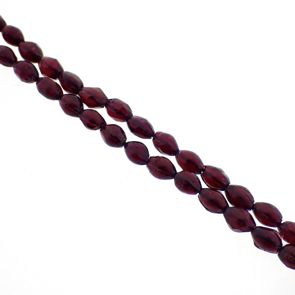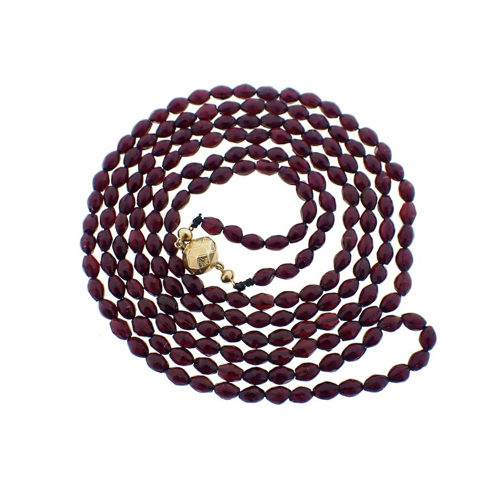 Antique necklace made of a single, long strand of dark red glass beads. The glass beads resemble garnet. A long necklace like this was once called a sautoir. These long necklaces emphasized the woman's hips through the sparkle and clink of the beads. The necklace can also be folded in half once or twice. The clasp is worn at the side. The paston clasp is made of 14-karat yellow gold (585/1000).