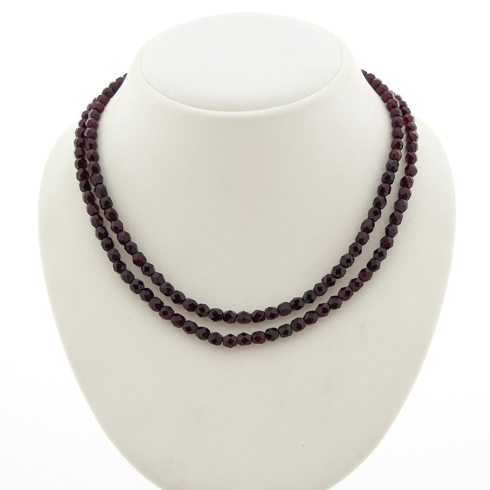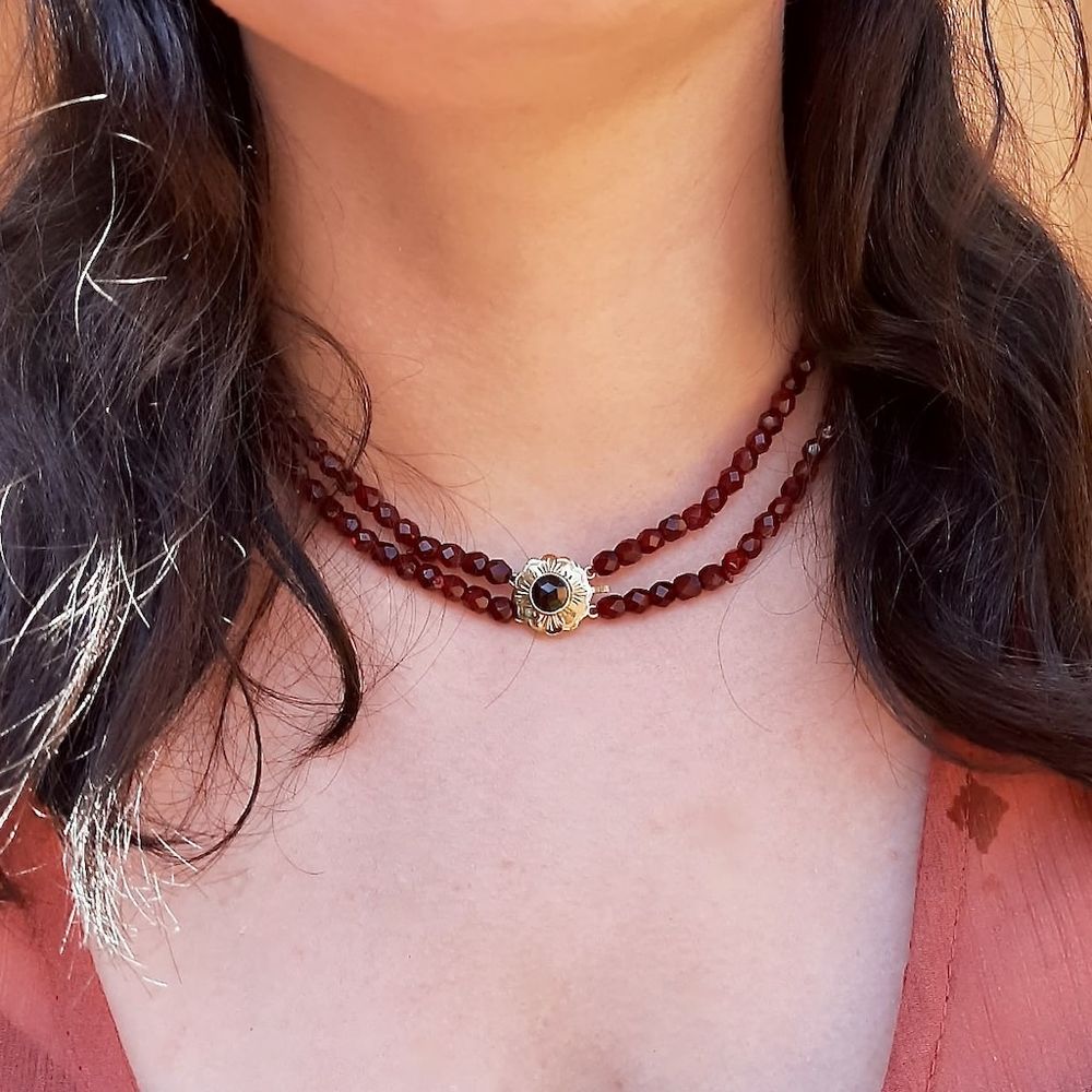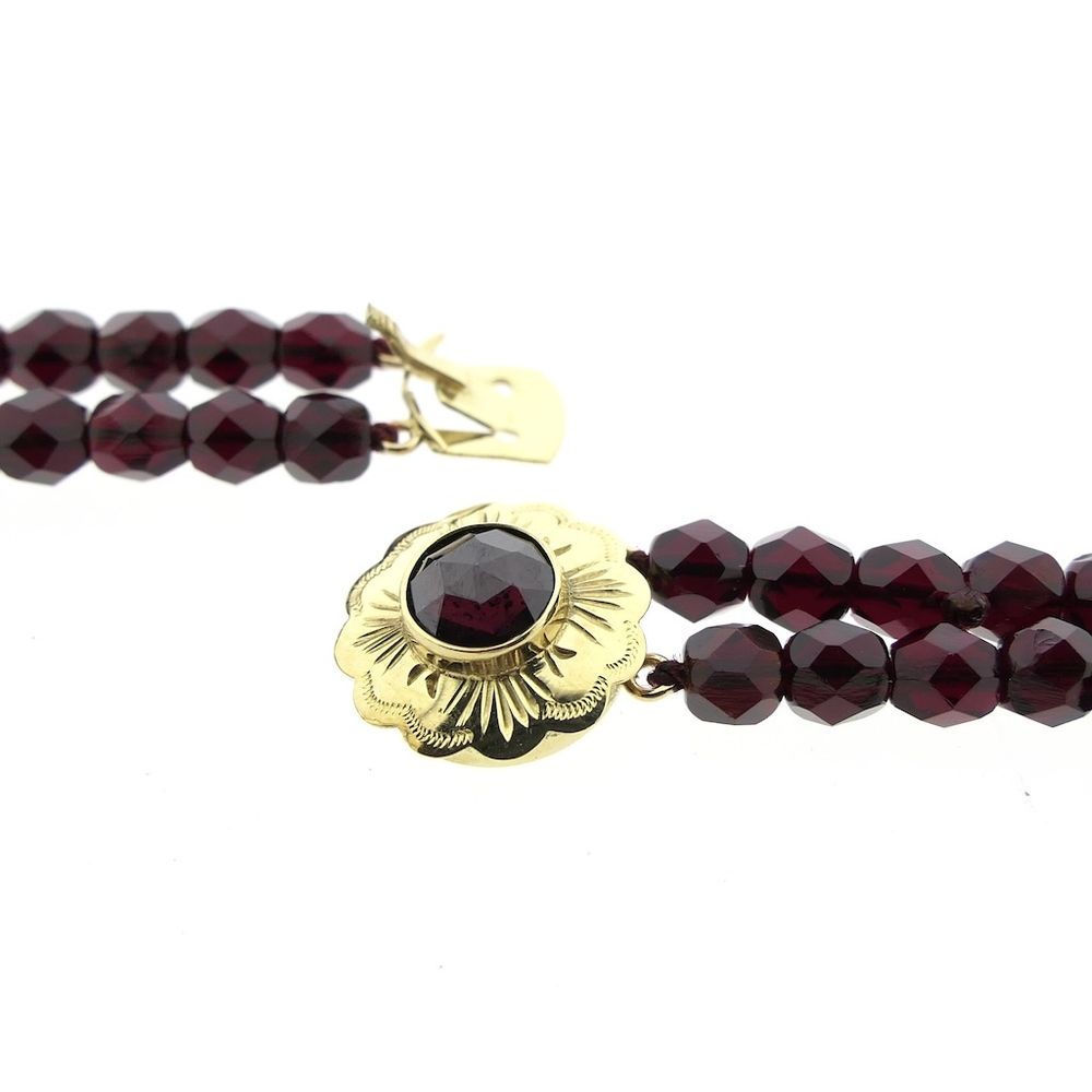 Antique necklace made of two strands of dark red glass beads. The beads, approximately 4.5 mm in diameter, are faceted and strung on cord. A beautiful piece of jewelry with a striking and elegant appearance. The clasp is set with a garnet and has an elegant frame crafted from 14-karat yellow gold (585/1000).