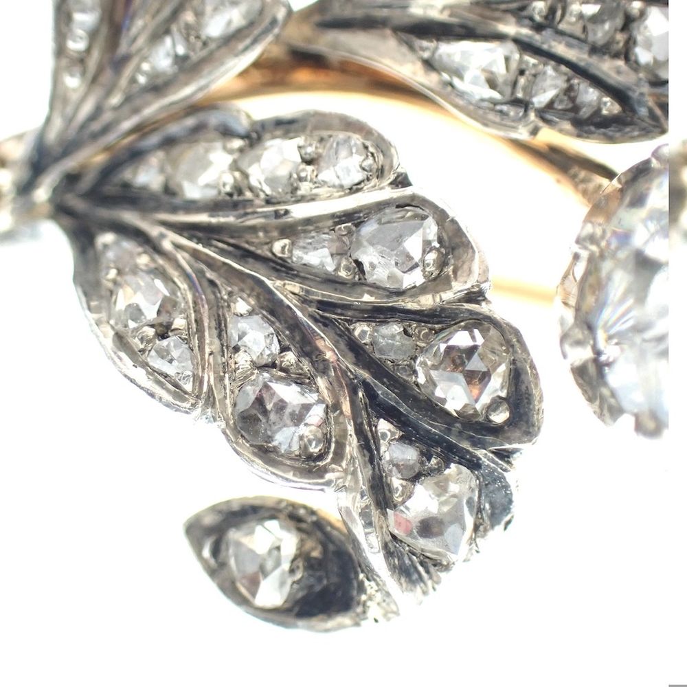 Antique gold and silver brooch. The brooch has a floral design and is set with Amsterdam rose-cut diamonds with a total weight of approximately 1.00 ct. This cutting method was used from the 16th to the 19th century. This brooch is estimated to date from 1875. The diamonds are set in silver. It is a beautiful and unique antique piece of jewelry. Tip: Diamonds used to be set on a piece of foil. This should not get wet! Clean only with a dry cloth. The brooch is made of 18-karat yellow gold (750/1000) and second-grade silver (835/1000).
