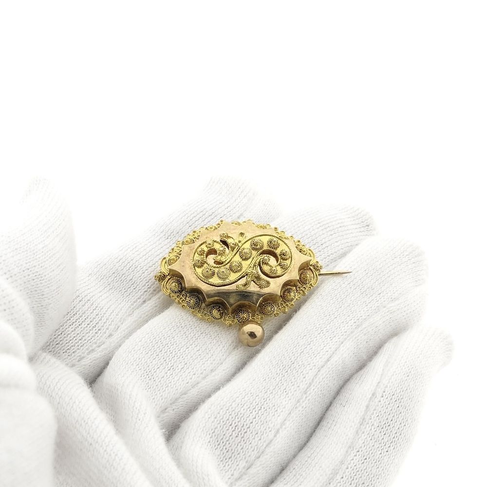 Antique gold brooch made from a worn bonnet bell. This is a unique piece of jewelry from the Dutch traditional costume period around 1900. The bonnet bell was attached to an undercap, which was worn on Sundays with Sunday clothes. Nowadays, almost no one wears such a bonnet anymore, but the bonnet bell is a beautifully detailed piece of jewelry. That's why they are now made into brooches, among other things. The frame is detailed with filigree technique, with a dangling tassel at the bottom. The brooch is made of 14-karat yellow gold (585/1000).
