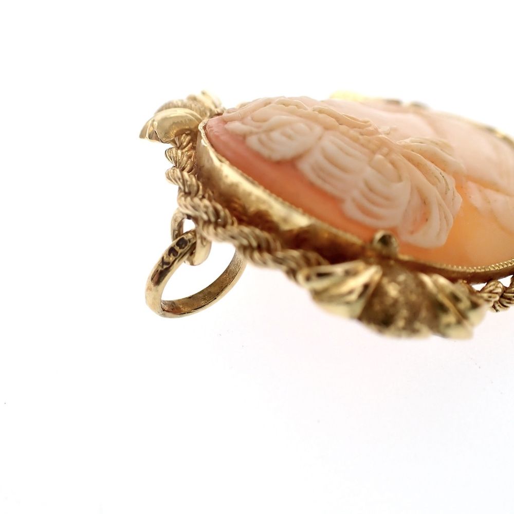 Antique gold brooch/necklace pendant with a cameo. The cameo features a beautifully carved portrait of a woman. The pendant is finished with twisted gold wire and four beautiful clasps that hold the cameo. It is a beautiful antique piece of jewelry. The pendant is crafted from 18-karat yellow gold (750/1000).