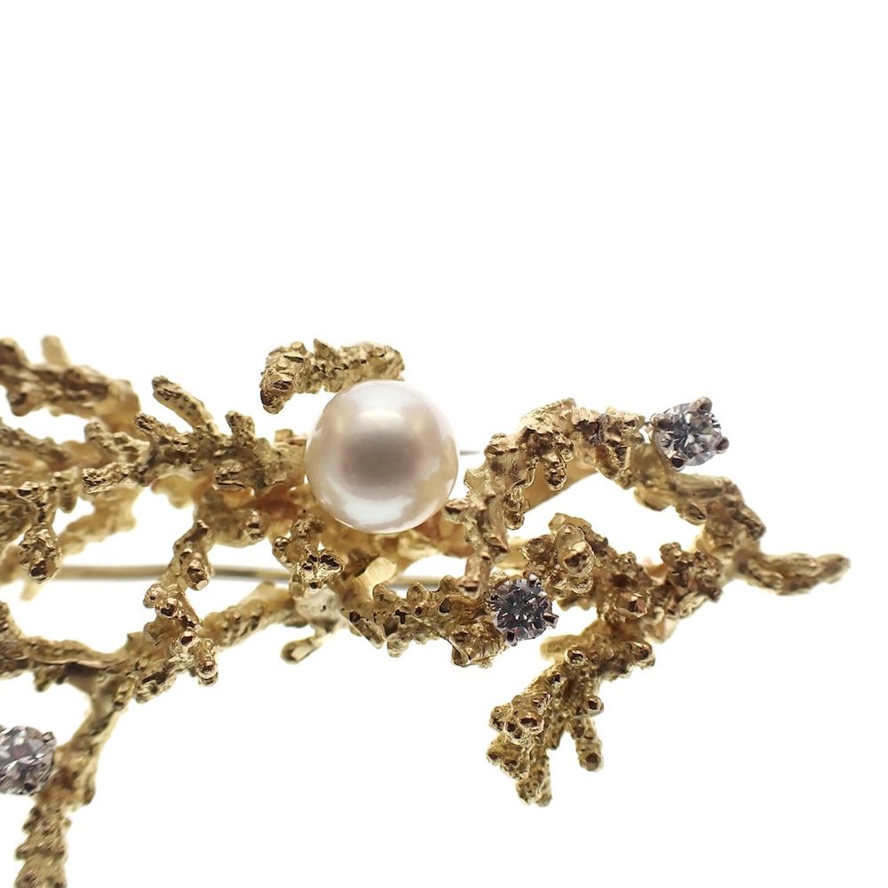 Antique gold brooch with a coral branch, pearl and diamonds 0.35 ct.