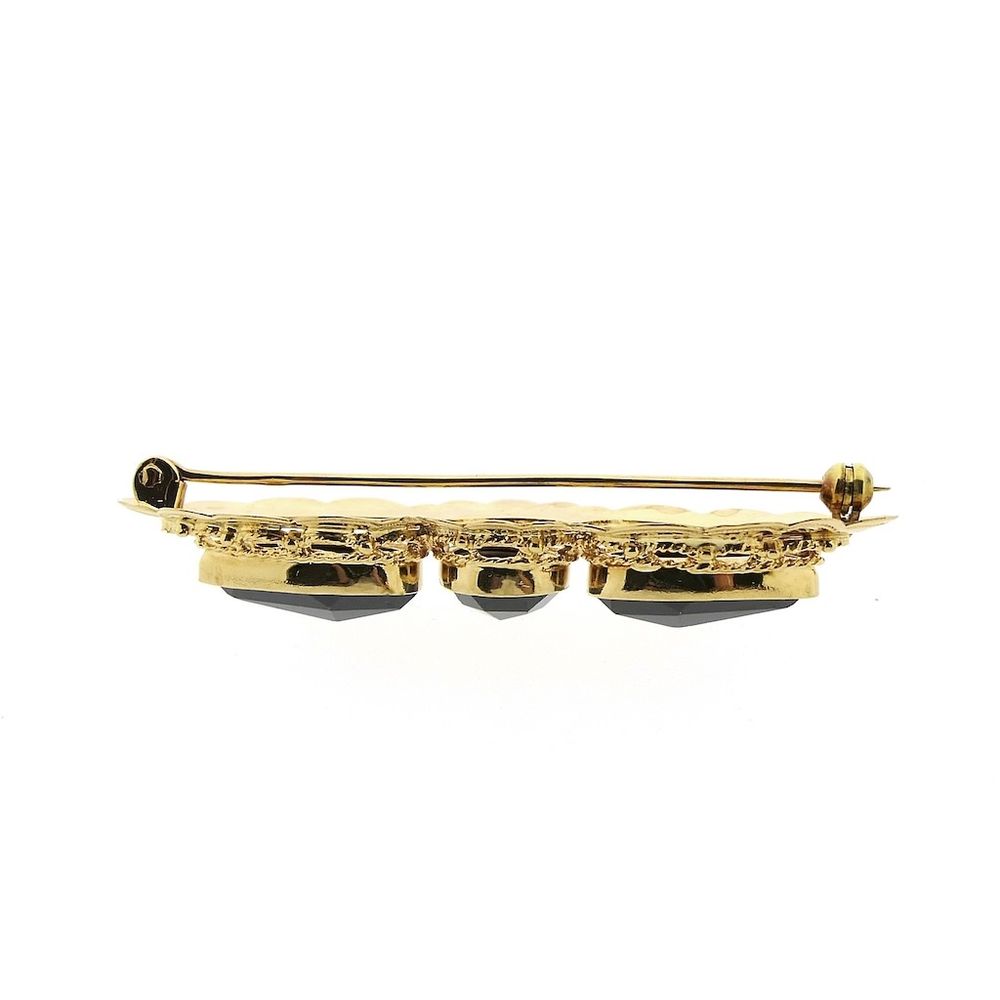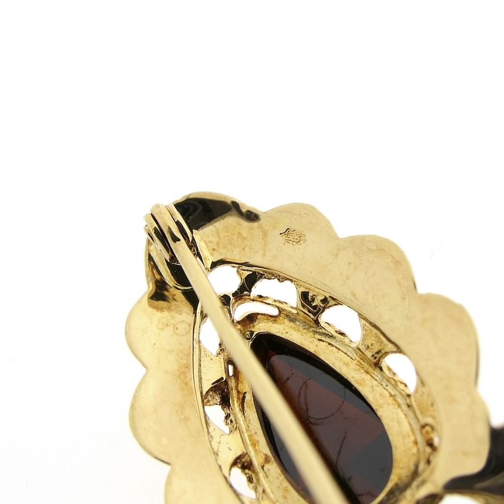 Antique gold brooch set with three brown-red garnet stones. The brooch's frame has a lace-like appearance. This beautiful brooch is crafted from 14-karat yellow gold (585/1000).