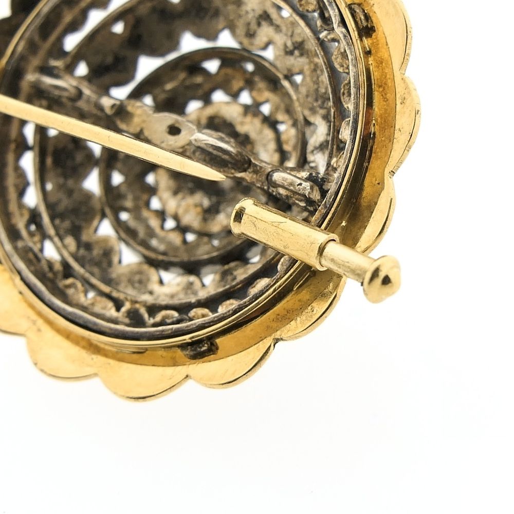Antique gold brooch with rose-cut diamonds set in Victorian-era silver. The rose-cut diamonds have a total weight of approximately 0.22 ct. This beautiful and classic brooch is crafted from 14-karat yellow gold (585/1000) and sterling silver (835/1000). The brooch can be fastened with a pin.