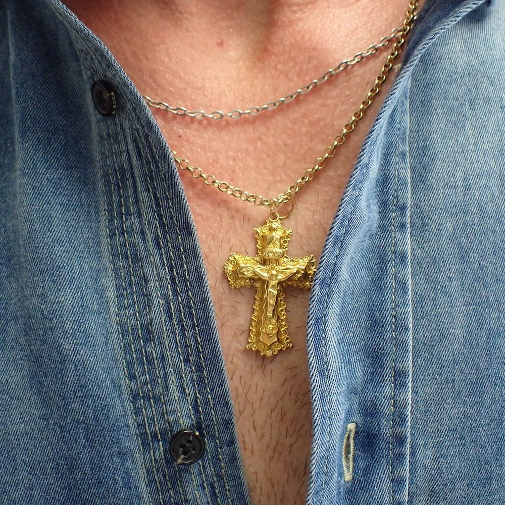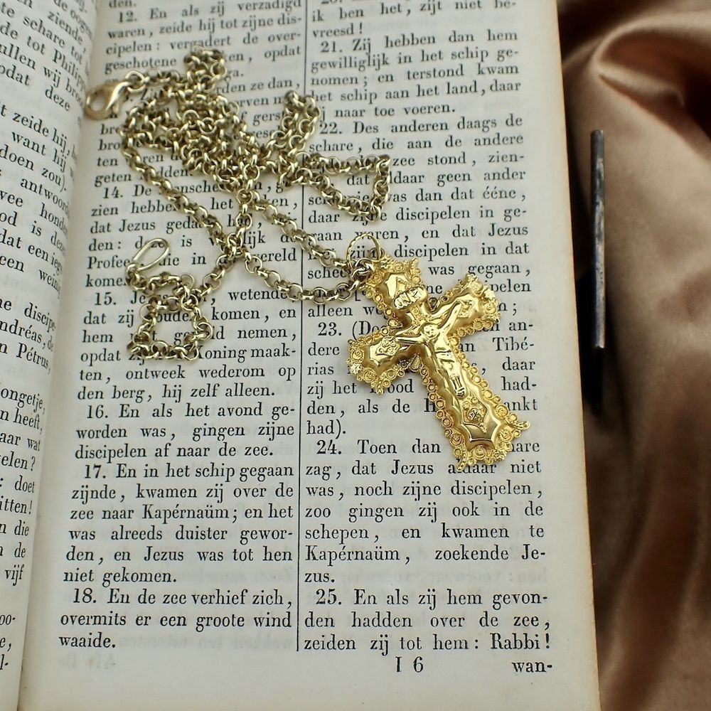 Antique gold pendant depicting the cross of Christ with its corpus. At the top of the cross is a small sign with the inscription "INRI," which means "Iesus Nazarenus, Rex Iudaeorum," Jesus of Nazareth, King of the Jews, in Latin. The cross is beautifully detailed and dates from the 19th century. The pendant is made of 14-karat yellow gold (585/1000).