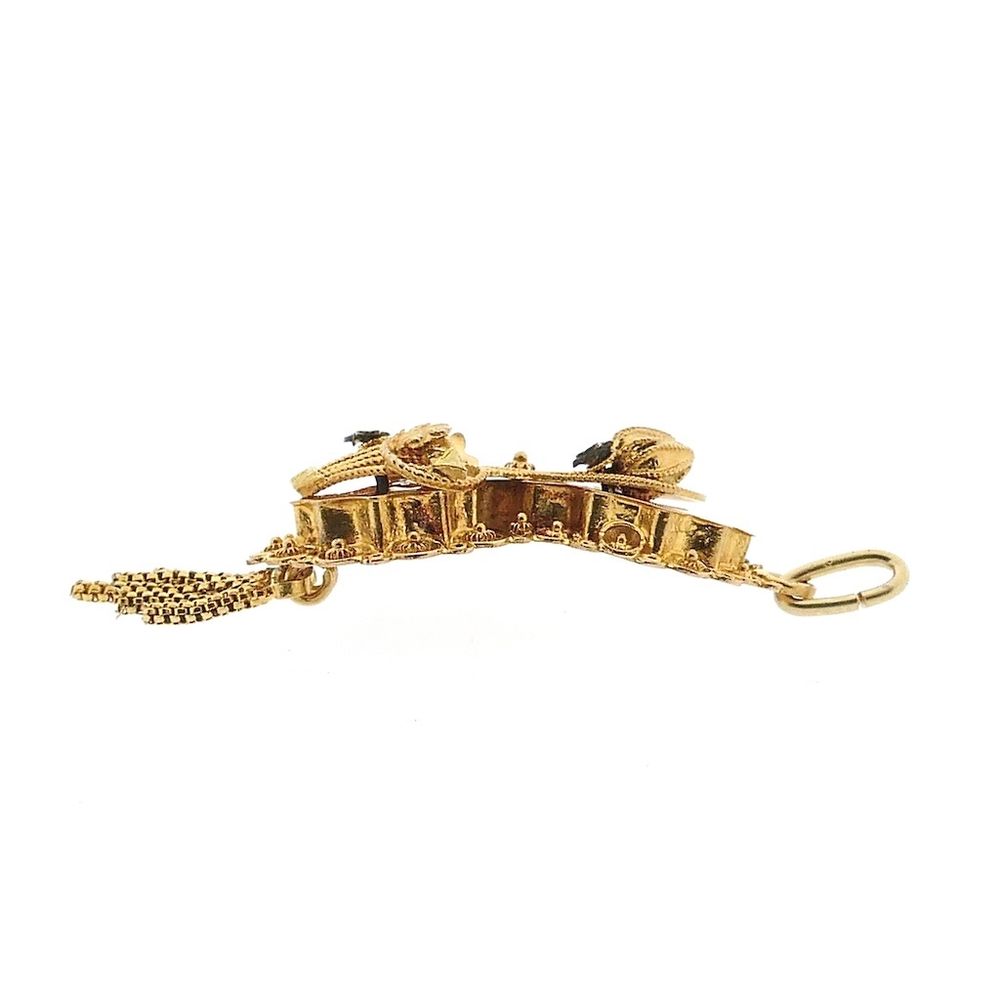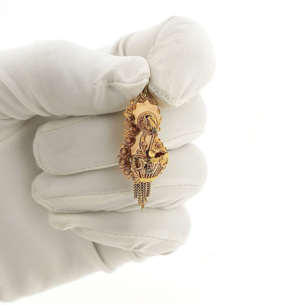 Antique gold pendant of a detailed bonnet bell. The bonnet bell is a unique piece of jewelry from the Dutch traditional costume period around 1900. It was attached to an undercap, which was worn on Sundays with Sunday clothes. Nowadays, almost no one wears such a bonnet anymore, but the bonnet bell is a beautifully detailed piece of jewelry. That's why they are now made into pendants, among other things. A beautiful piece of jewelry with a history. The pendant is made of 14-karat yellow gold (585/1000).
