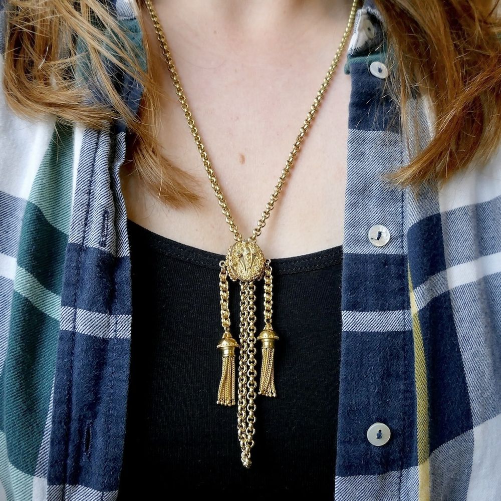 Gold slide chain with pendant and tassels. The chain is made with the classic jasseron link chain. This is a continuous chain of round, semi-hollow links. The pendant is crafted from rose gold and detailed with a filigree technique. This lace-like technique gives the chain an antique look. The pendant slides along the chain. A beautiful and unique piece of jewelry to wear. The chain closes with a lobster clasp and is made of 14-karat yellow gold (585/1000).