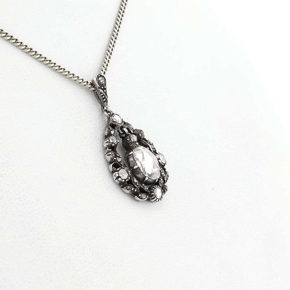 Antique silver pendant set with a total of approx. 0.93 ct. rose-cut diamonds. The large diamond 'dangles' as it were in the pendant. This pendant is made of second-grade silver (835/1000).