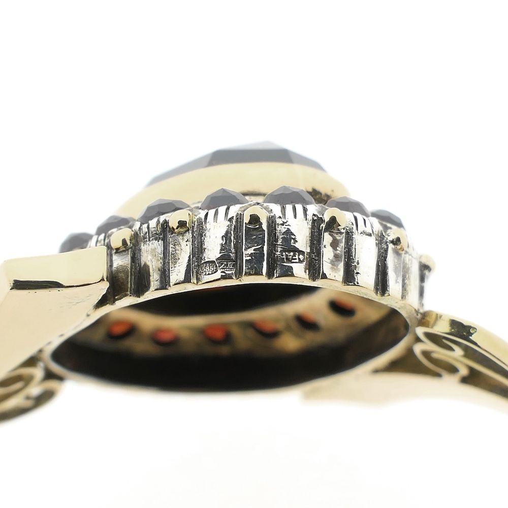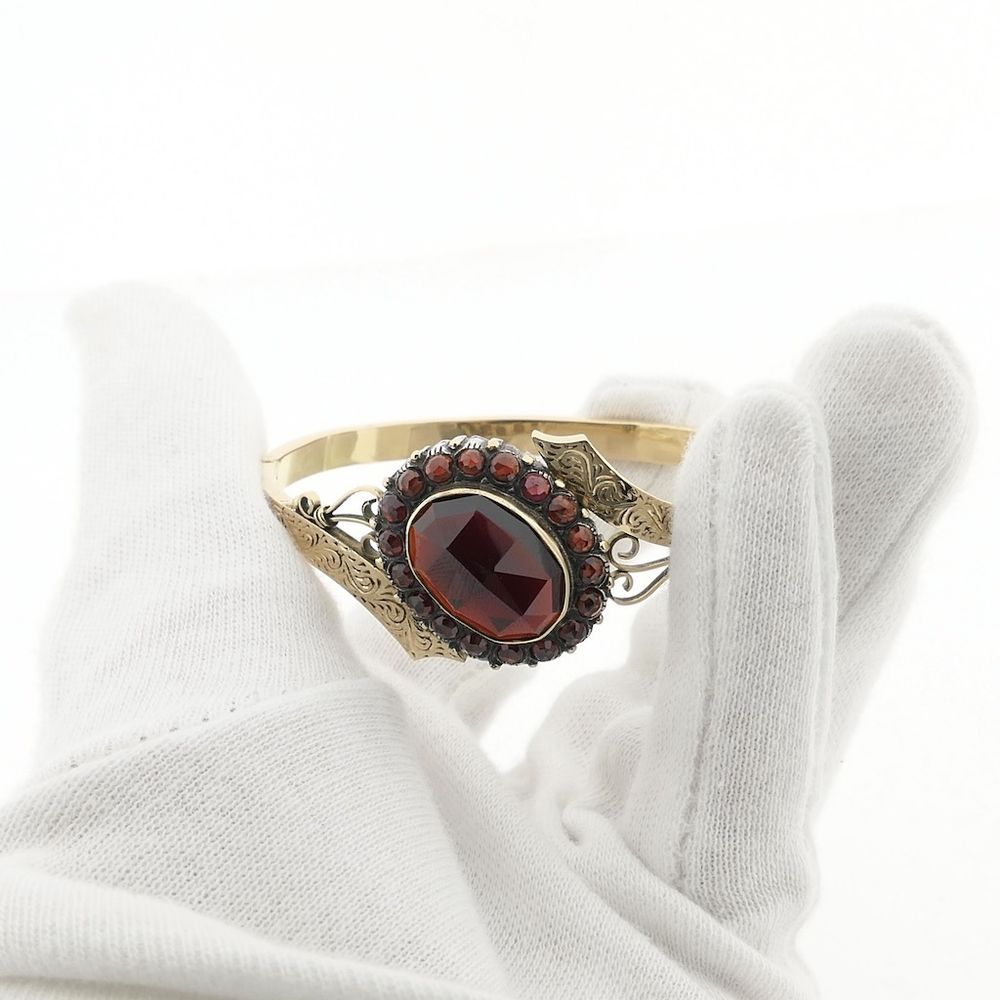 Antique gold and silver bangle set with garnet stones. The smaller garnets are set in silver. This was often done in the Victorian era (1837–1901) to make the gemstones stand out even more. The elegant engravings, also typical of this era, give the bracelet a vibrant appearance. A beautiful women's bracelet with a history. The width of the bracelet tapers from 4.9 mm at the band to 25.9 mm at the top. The bracelet is made of 14-karat yellow gold (585/1000) and second-grade silver (835/1000).