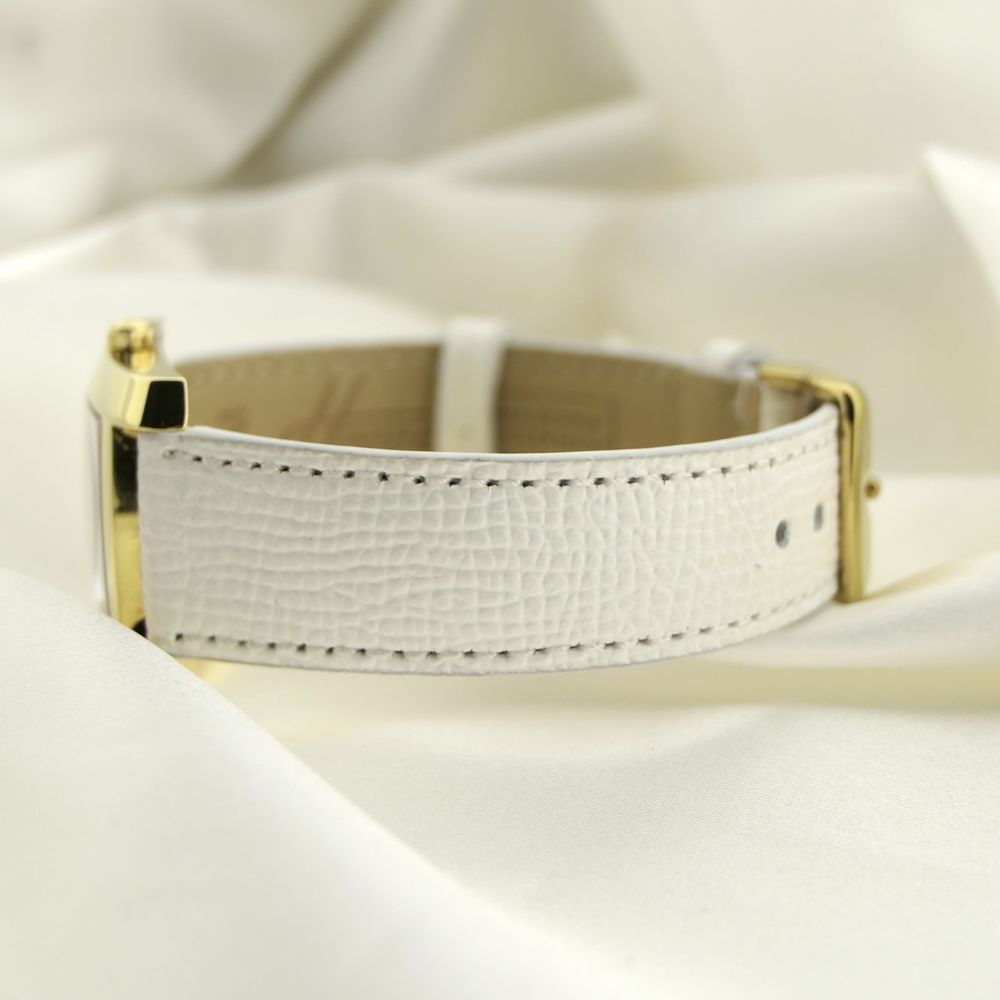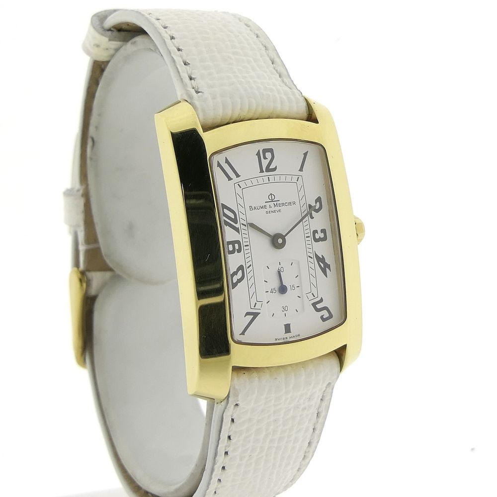 Beautiful 18-karat gold dress watch from the renowned Swiss Baume Mercier, Hampton model. It features a heavy gold case, crocodile leather strap, and an original Baume & Mercier folding clasp. The dial is beautifully crafted with guilloché relief and applied numerals/indices. A perfect choice for both business and chic occasions, this watch fits both men and women with its 26mm x 40mm case. The gross weight of the case (without the strap) is over 35 grams. This watch features a Swiss-made quartz movement; a new battery will be installed in 2025, so it will last for years to come. We've left the original strap as is; it's worn but perfectly wearable, and it comes with the original Baume & Mercier (gold-plated) clasp. We'll include a new, perfectly matching white, high-quality leather strap. This watch also comes in the original Baume & Mercier box with an in-house warranty report and a 1-year warranty.