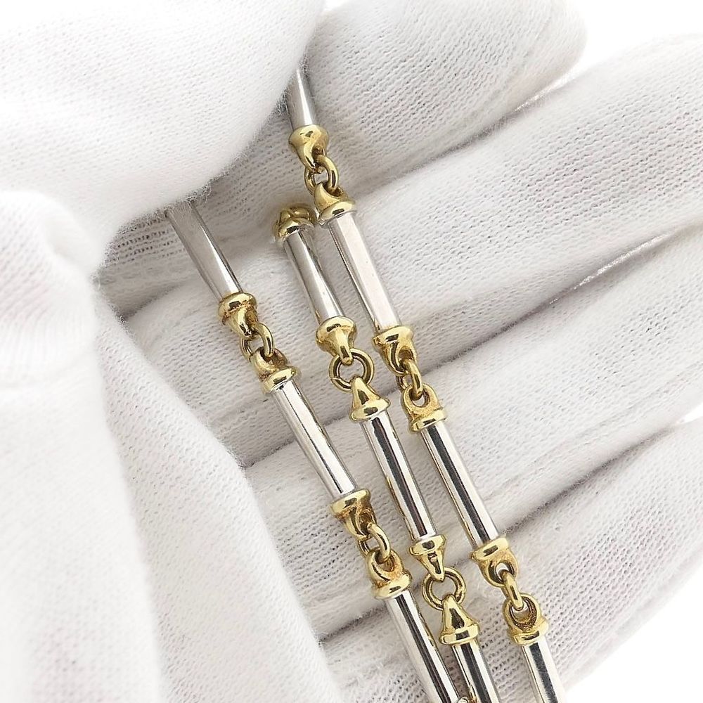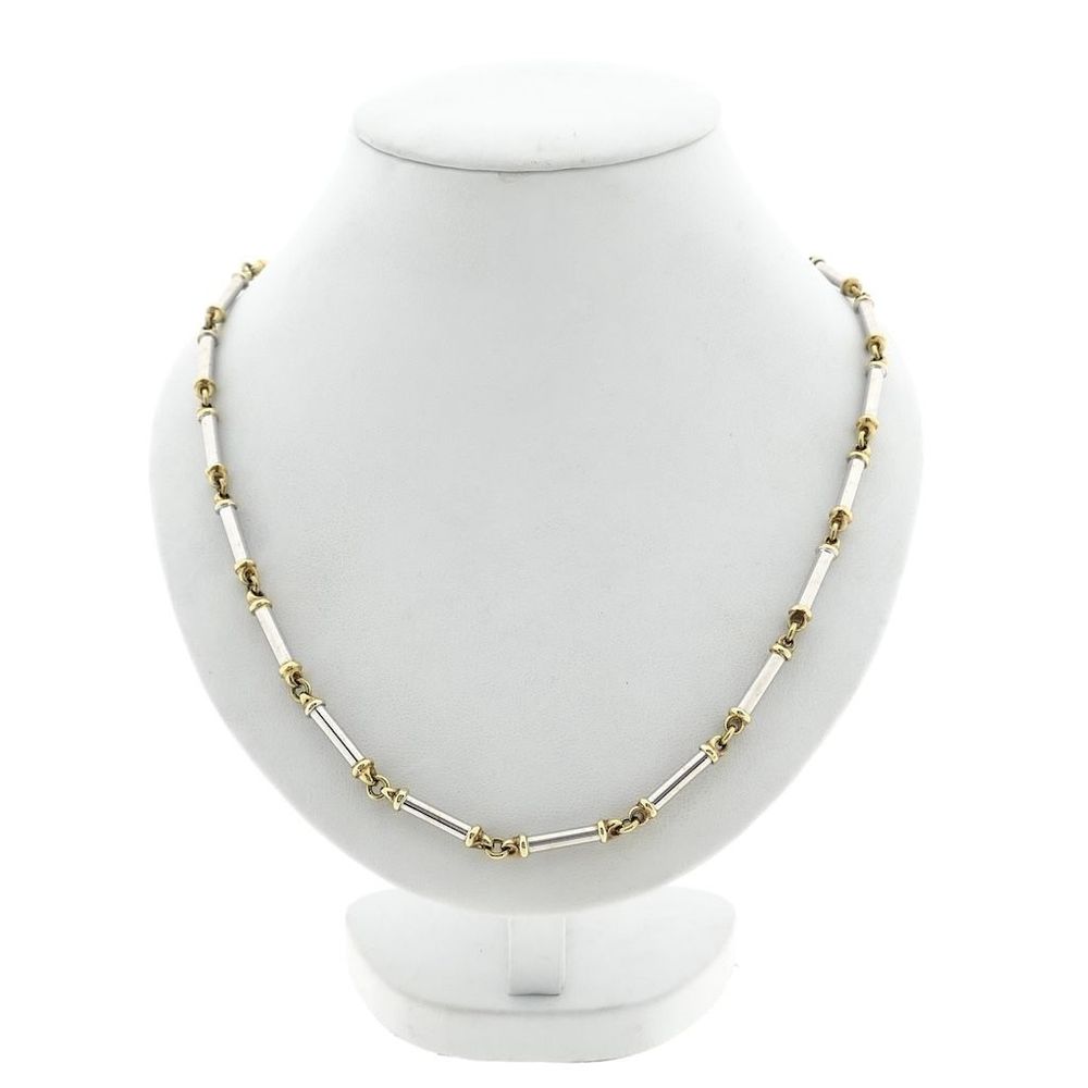 Bicolor gold bar link necklace. The design is inspired by the characterful jewelry of Scott Kay, known for his powerful combinations of contrasting precious metals and architectural shapes. This beautiful and bold necklace is made of 14 karat white and yellow gold (585/1000).