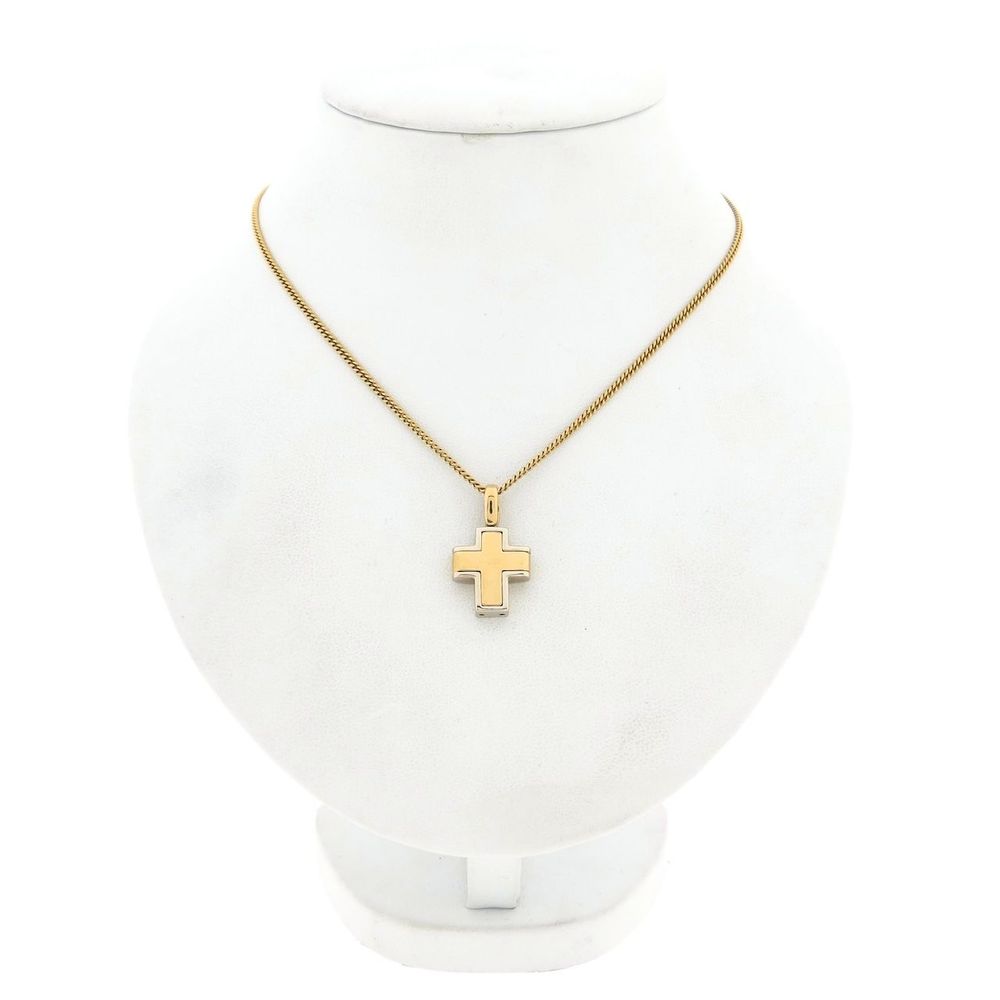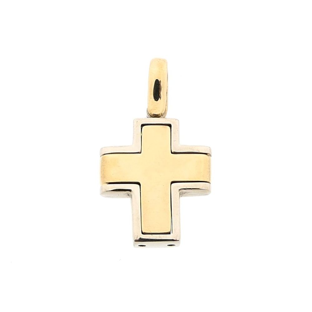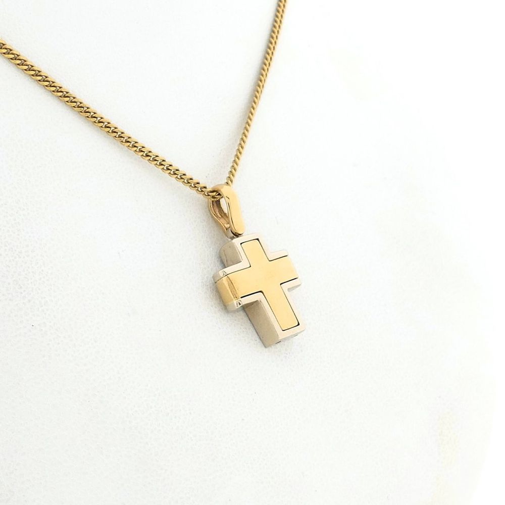 Bicolor gold cross pendant. The pendant has a smooth finish and is made of 14 karat white and yellow gold (585/1000).