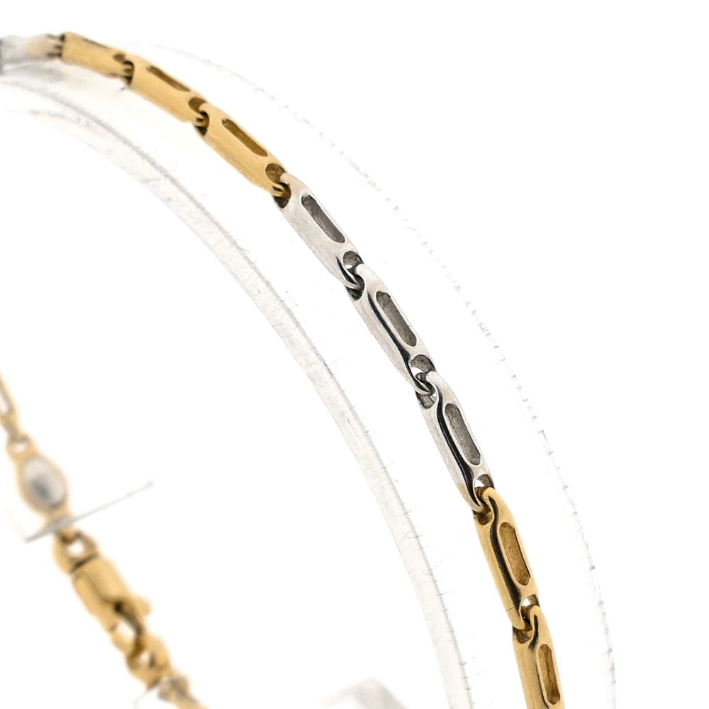 Bicolor gold bracelet with fantasy links. The bracelet has a glossy finish and is made of 14 karat white and yellow gold (585/1000).