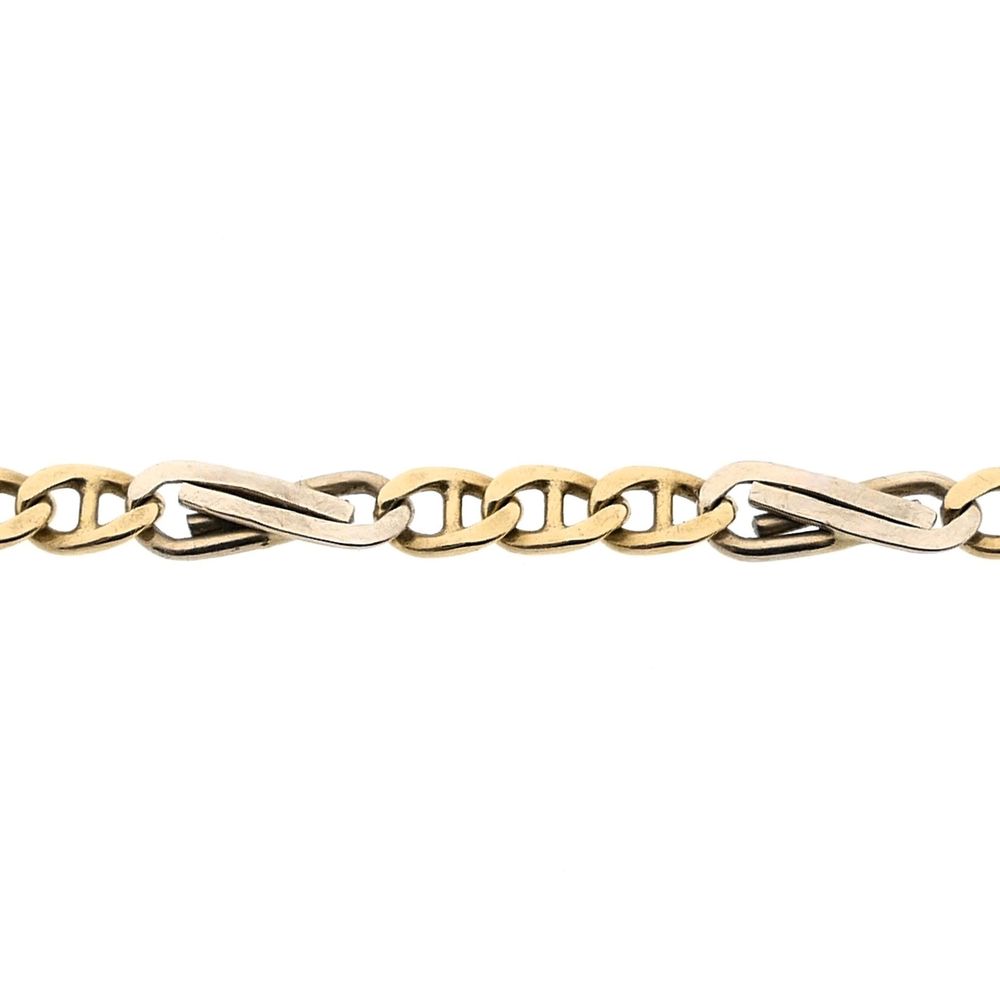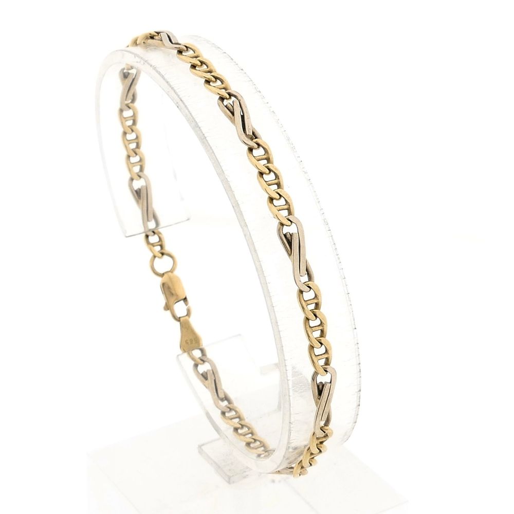 Bicolor gold bracelet with fantasy links. The bracelet features a glossy finish and is made of 14 karat white and yellow gold (585/1000).