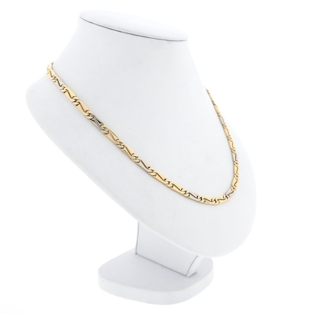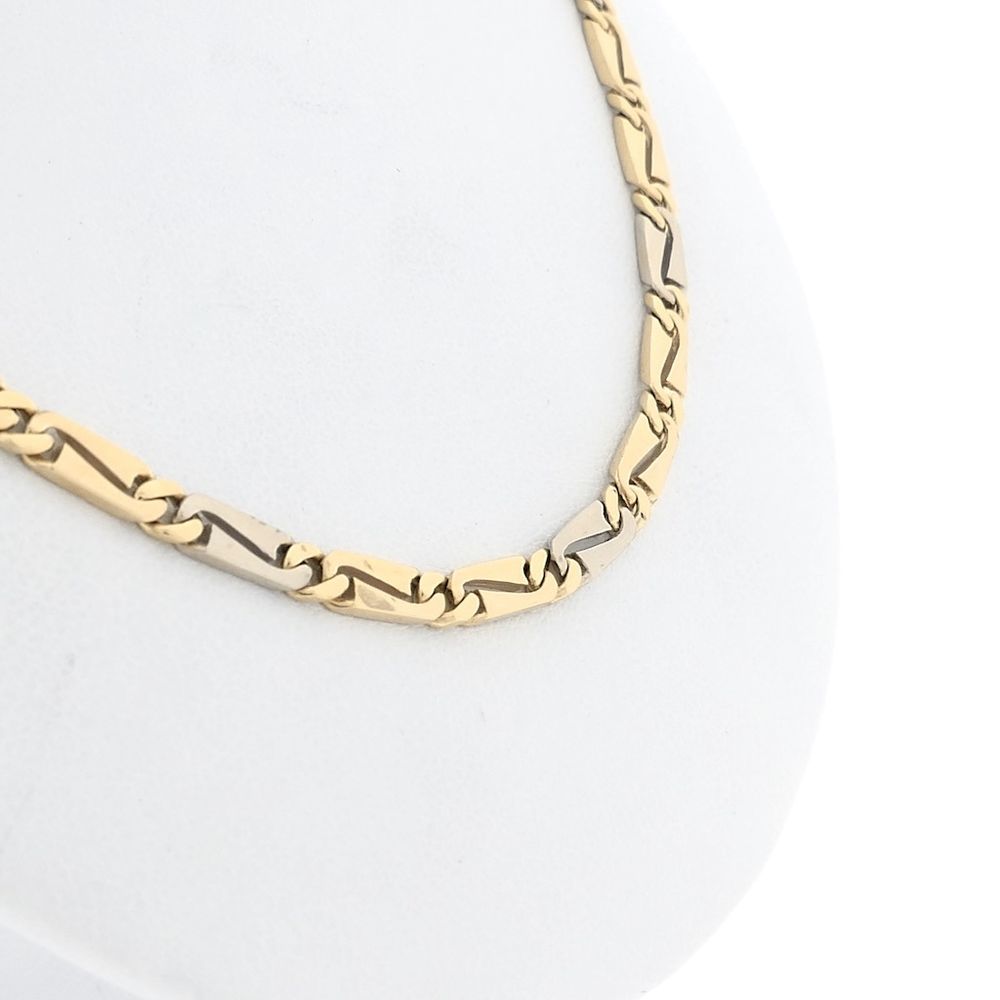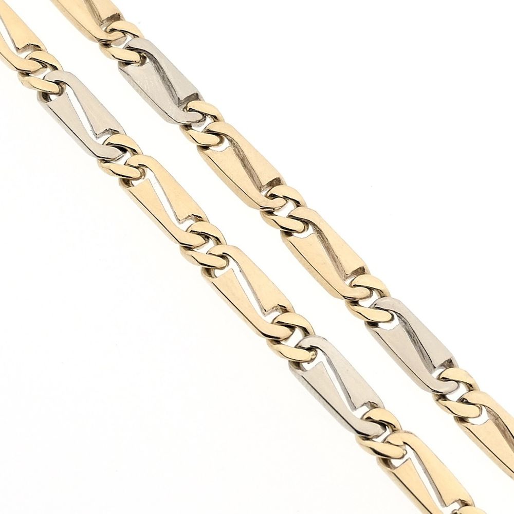 Two-tone gold fantasy link necklace. Every two yellow gold links are followed by a white gold link. The piece is crafted from 14-karat white and yellow gold (585/1000).