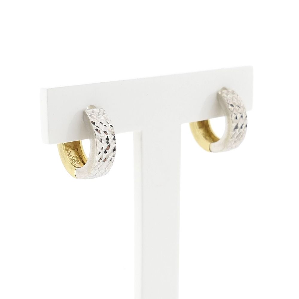 Bicolor gold hoop earrings. The white gold part features a patterned setting. This stylish set is made of 14 karat white and yellow gold (585/1000).
