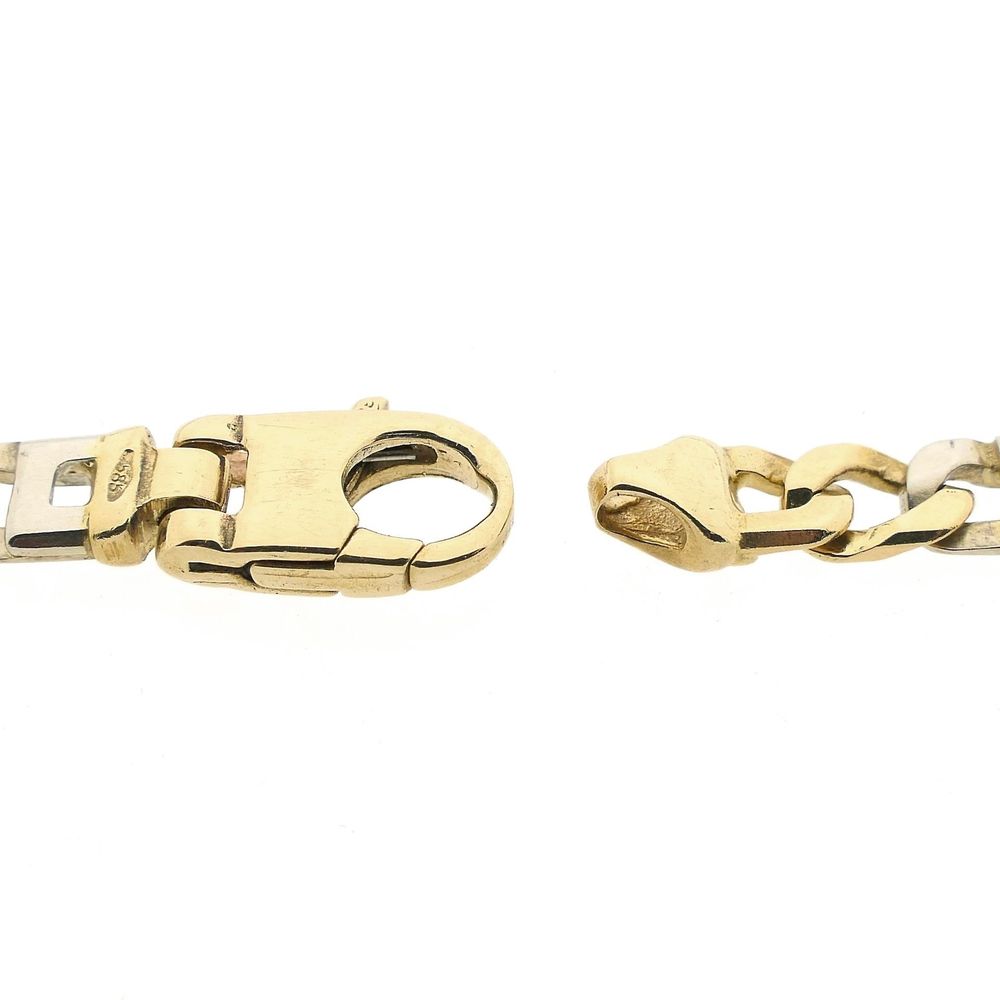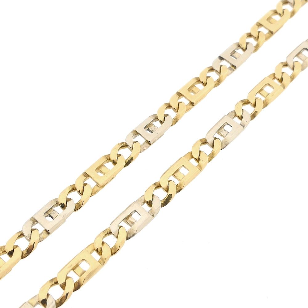 Bicolor gold marine link necklace. The links are alternately set in white gold. It is a solid design with a rugged appearance. The necklace is made of solid gold. The jewelry closes with a lobster clasp and is crafted from 14 karat white and yellow gold (585/1000).