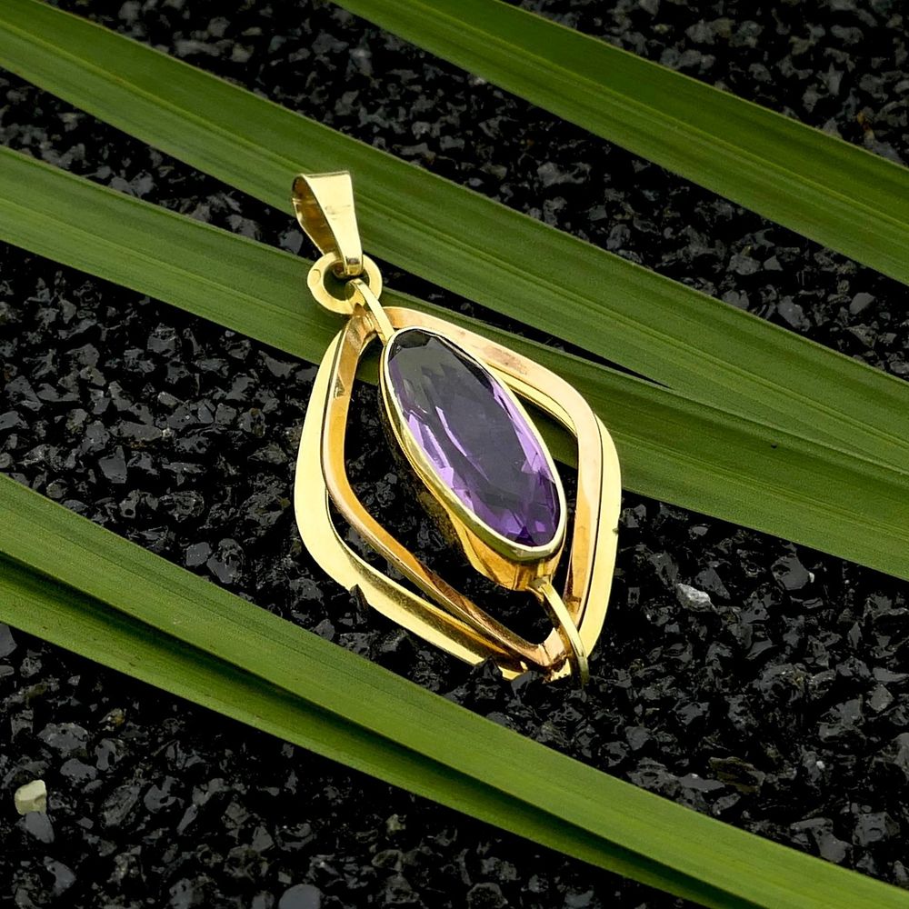 Bicolor gold pendant set with a synthetic purple gemstone. The gemstone has a beautiful purple color and is oval faceted. The setting consists of two openwork diamond shapes. The inner diamond is made of rose gold and the outer frame is made of yellow gold. A beautiful piece of jewelry and a real eye catcher. The pendant is made of 14 karat rose and yellow gold (585/1000).