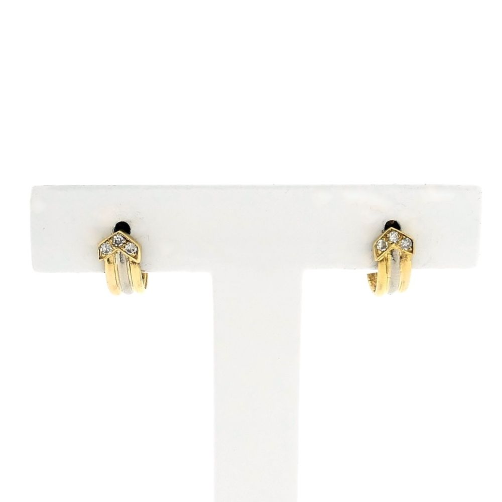 Two-tone gold stud earrings set with a total of 0.03 ct. of natural round brilliant-cut diamonds. The diamonds are set in a raised pattern at the top, with three curved lines of yellow and white gold below. The earrings are crafted from 18-karat white and yellow gold (750/1000).