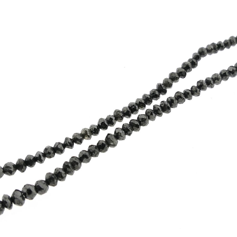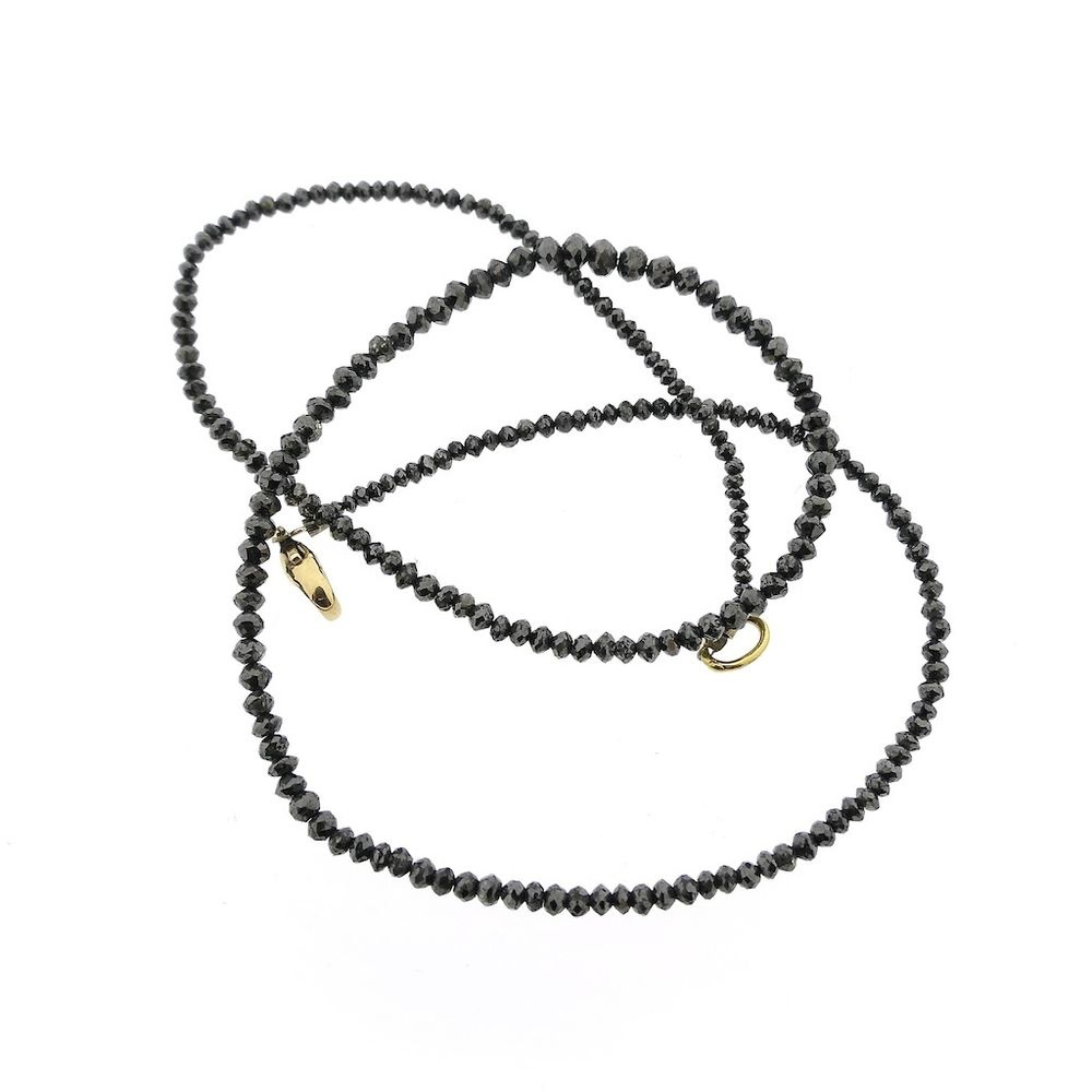 Black diamond bead necklace with a gold clasp. The beads, approximately 3.0 mm in diameter, are strung on an elastic cord. The necklace closes with a gold lobster clasp and is crafted from 14-karat yellow gold (585/1000).