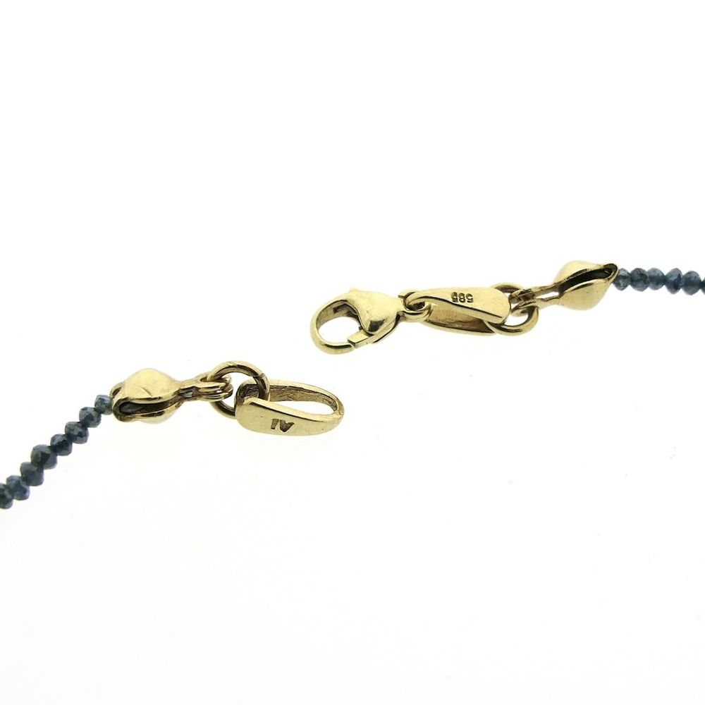 Gold beaded necklace with blue moissanite and a gold clasp. The stones are roughly faceted and strung on elastic cord. The necklace has a playful look. It closes with a lobster clasp and is crafted from 14-karat yellow gold (585/1000).