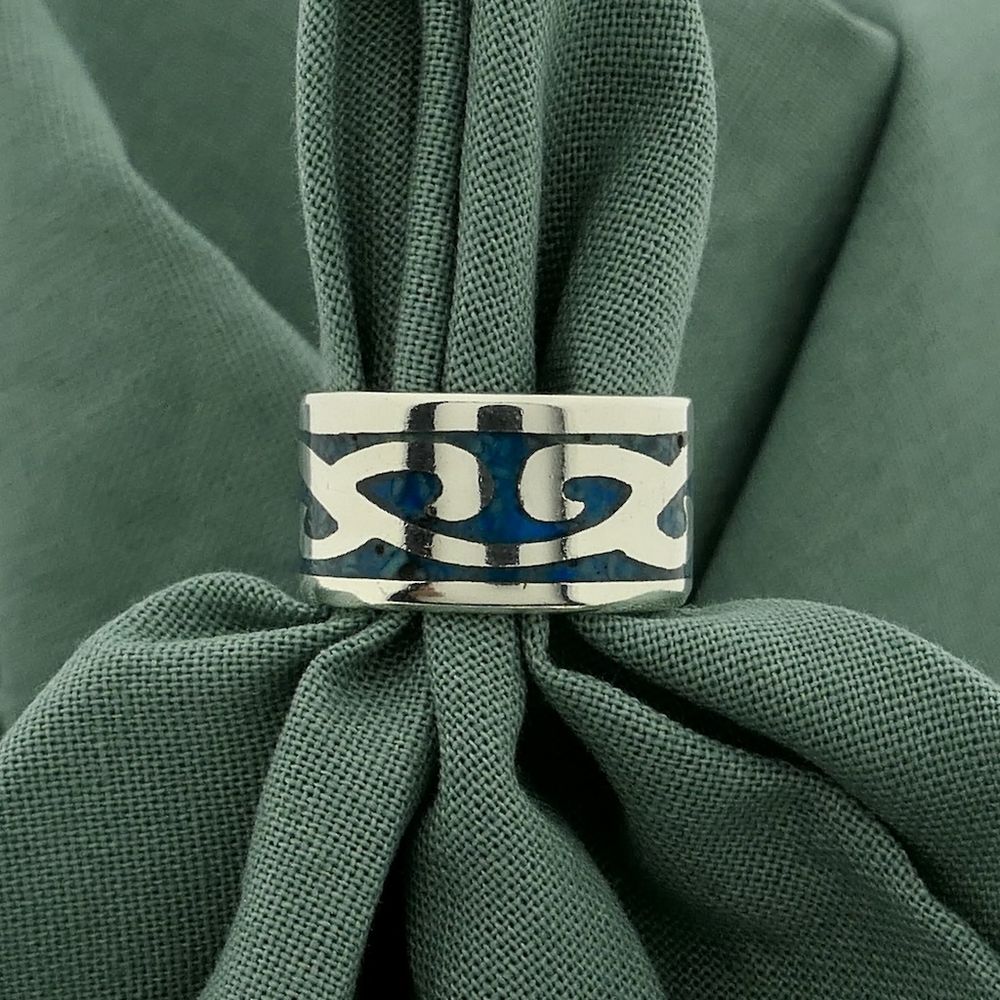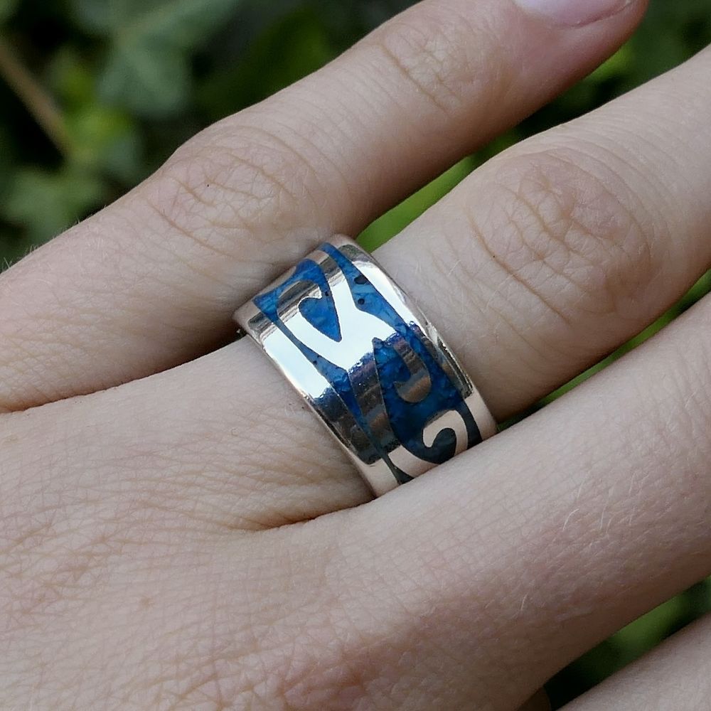 Wide silver ring with a detailed tribal pattern, decorated with blue enamel. The inside is smoothly finished and engraved with the Bombarie brand. The ring is made of second-grade silver (835/1000).