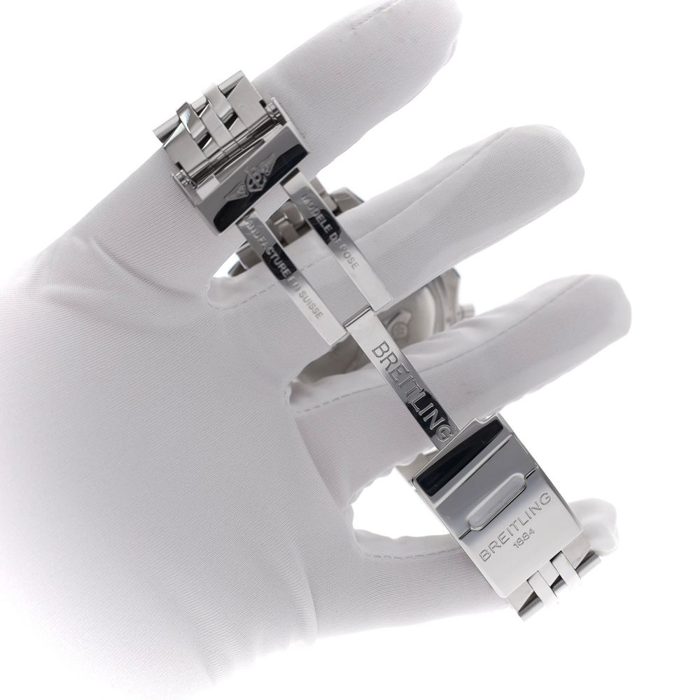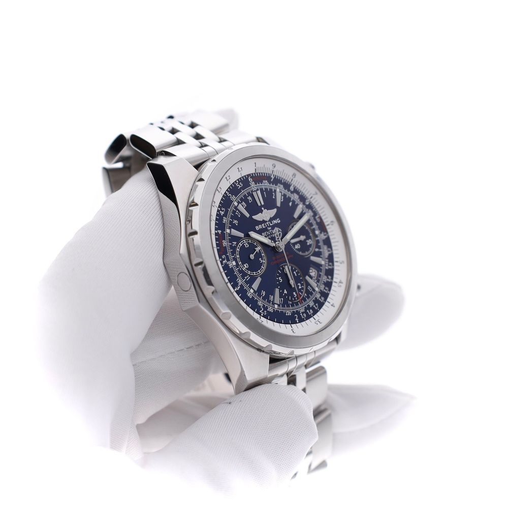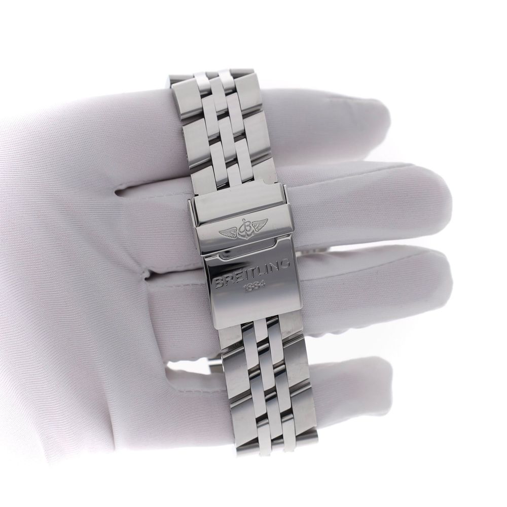 The watch is equipped with the distinctive Breitling 'Bentley' steel bracelet, which provides a solid and luxurious wearing experience. This bracelet is suitable for wrists up to approximately 19 cm. Additionally, an original 24mm Breitling leather strap is included, also in very good condition, ideal for variation or larger wrist sizes.