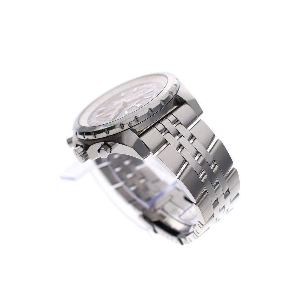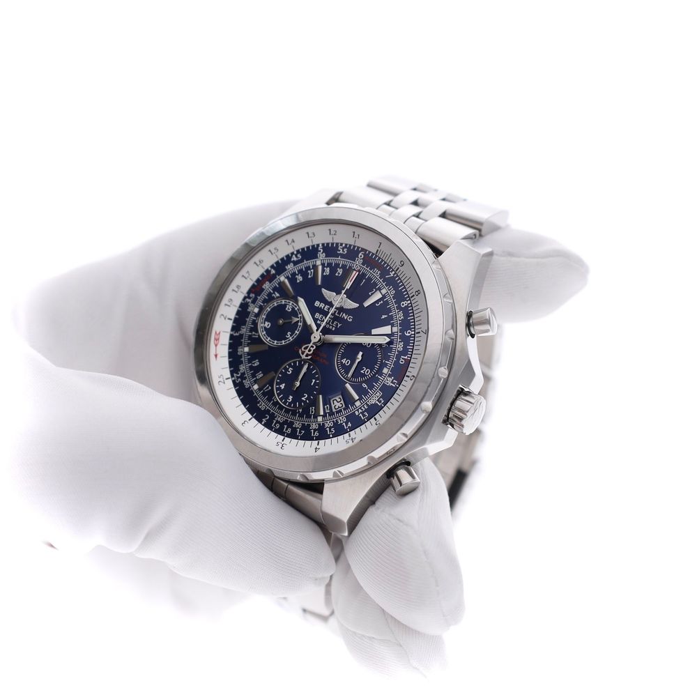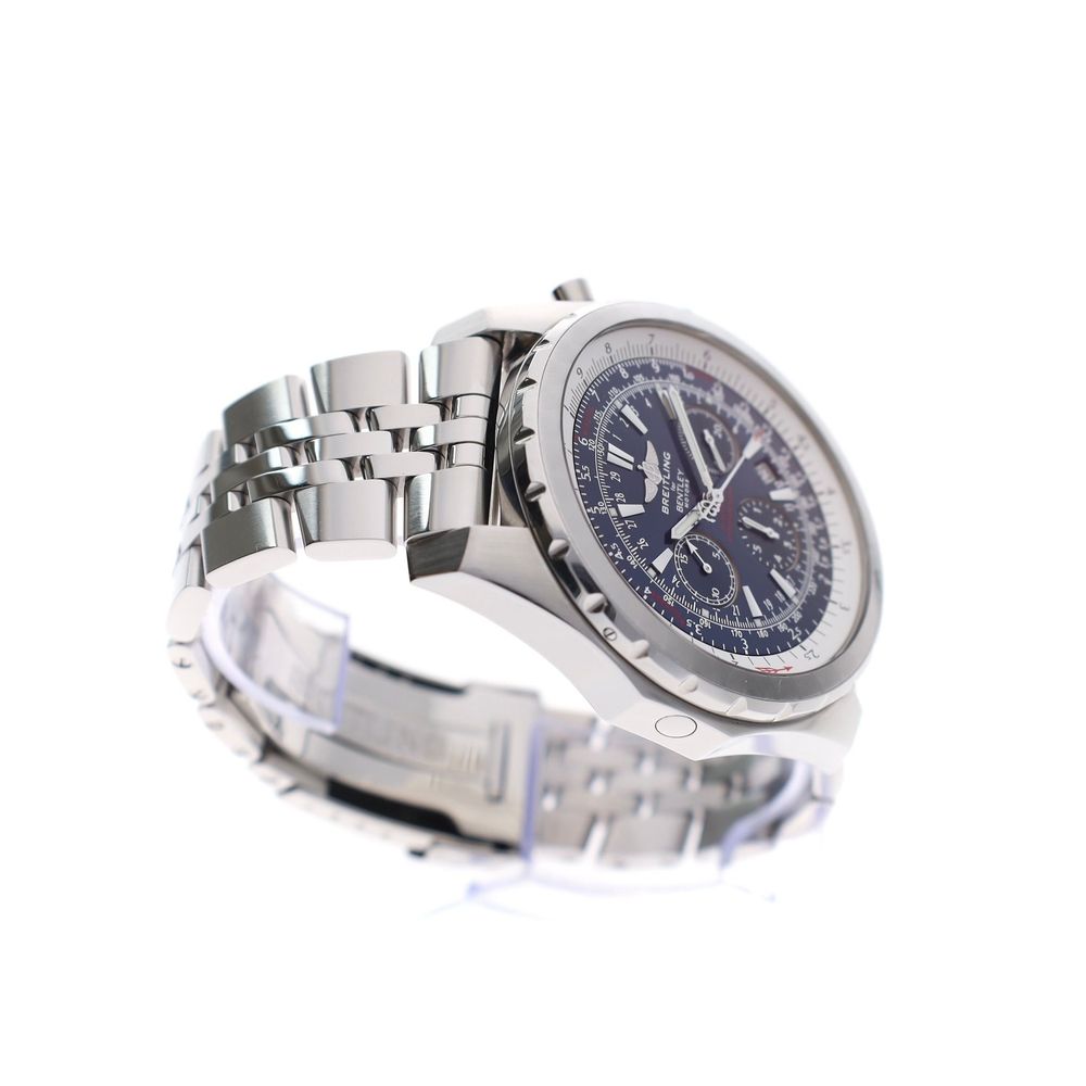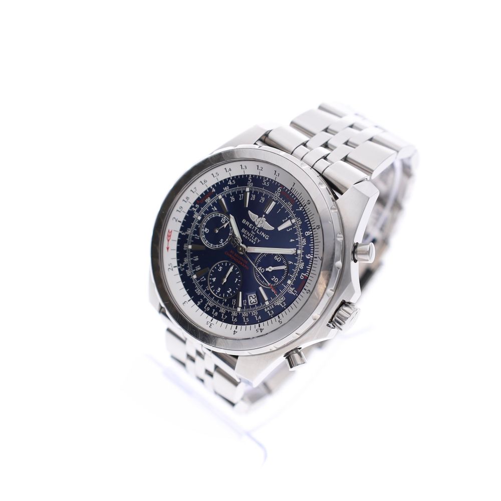The watch is equipped with the distinctive Breitling 'Bentley' steel bracelet, which provides a solid and luxurious wearing experience. This bracelet is suitable for wrists up to approximately 19 cm. Additionally, an original 24mm Breitling leather strap is included, also in very good condition, ideal for variation or larger wrist sizes.