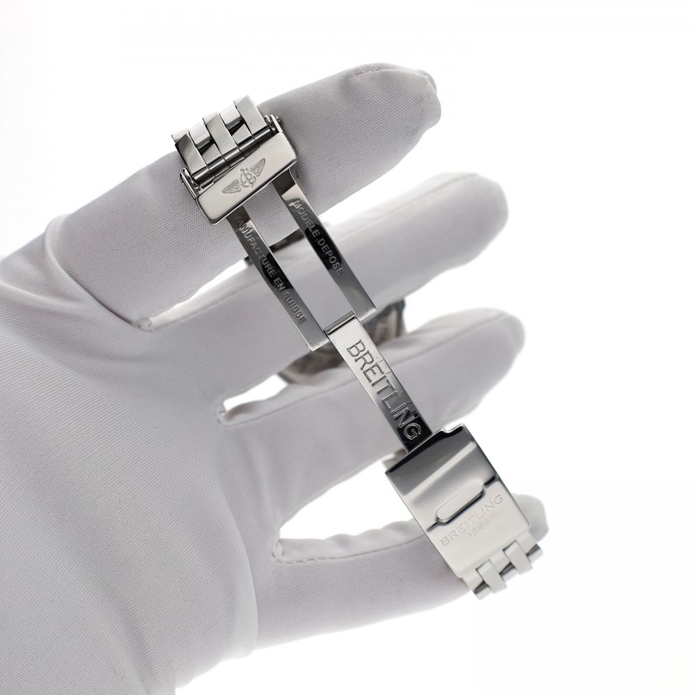 With a case size of 35mm, this model has a pleasant and versatile format that is clearly present without appearing bulky. The recognizable Breitling details, such as the rider tabs on the bezel, give the watch a powerful yet polished appearance. The polished steel band is comfortable to wear and feels substantial. This is complete with all links and suitable for wrists up to approximately 19cm.