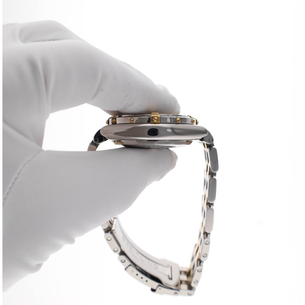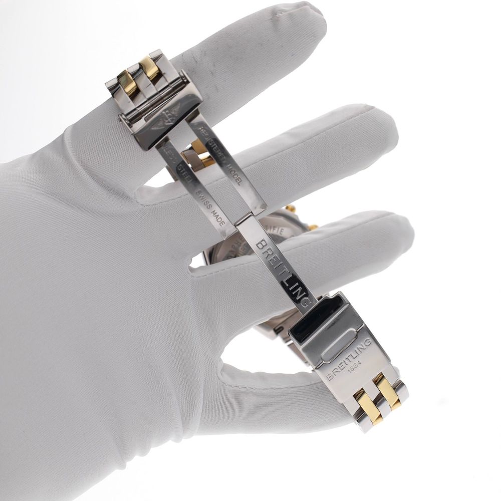 The case has a classic diameter of 40mm, a size that perfectly fits the traditional proportions of the Chronomat. The distinctive 18k gold rider-tabs on the bezel and the robust pilot style make the watch instantly recognizable as a true Breitling. The gold/steel Breitling pilot band is also in very good condition and fits wrists up to approximately 19cm.