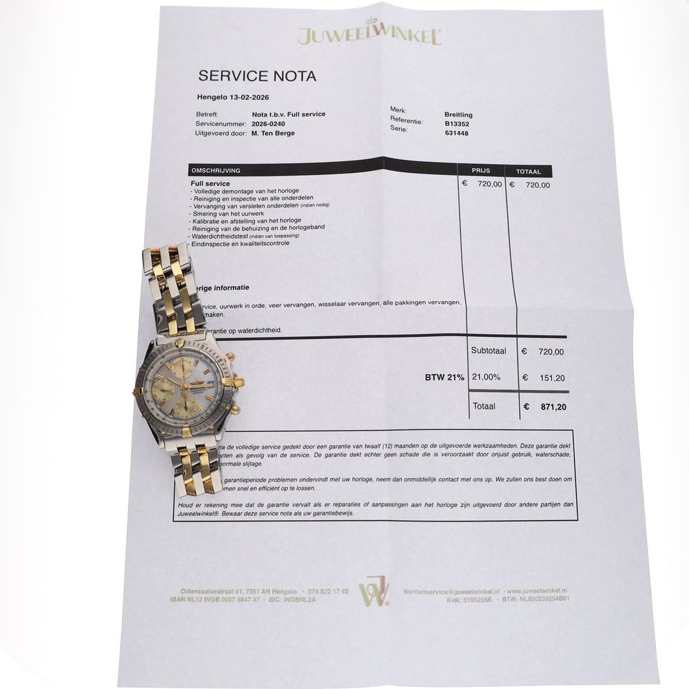 Inside, the reliable Breitling Caliber B13 powers the watch, an automatic chronograph movement with chronometer certification. This movement is known for its precision and robustness. This specific watch has also received a new full service in 2026, emphasizing its technical condition and reliability.