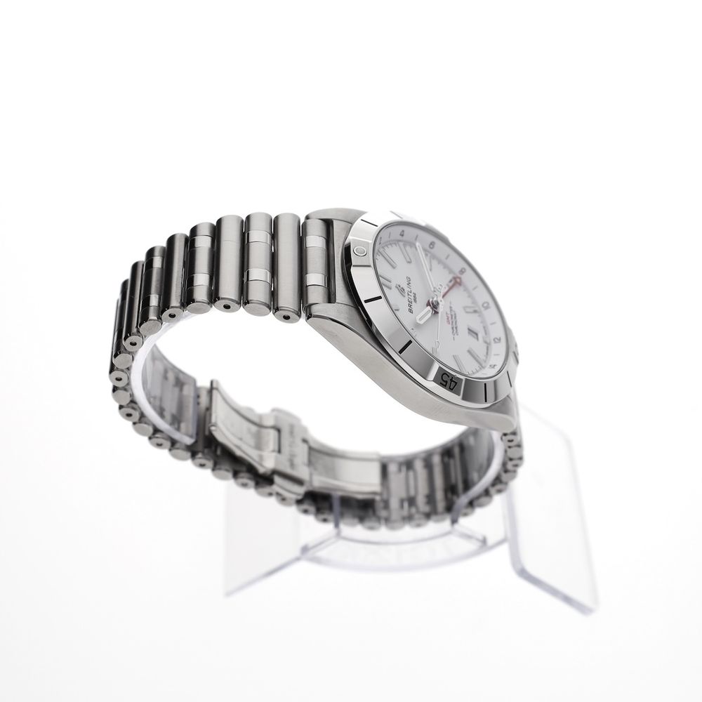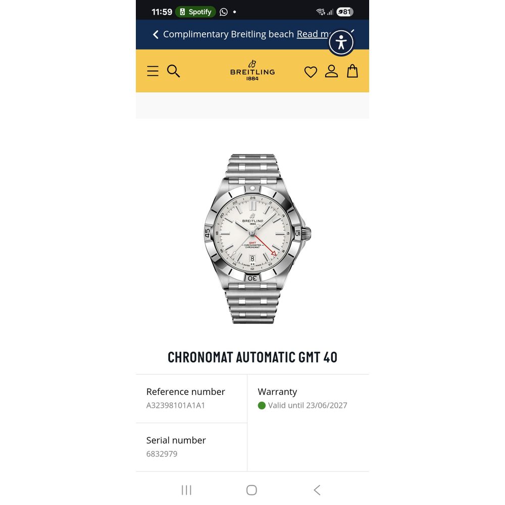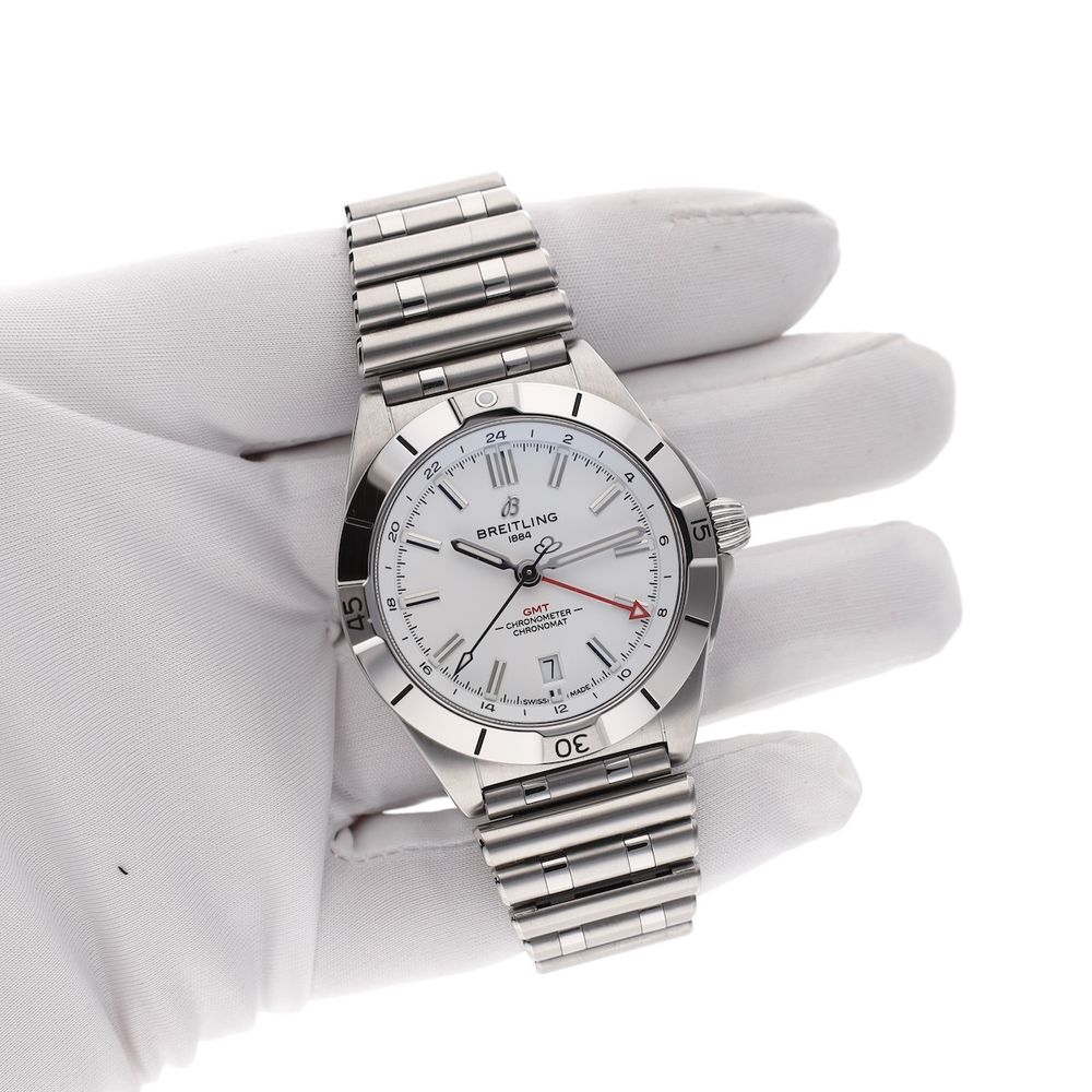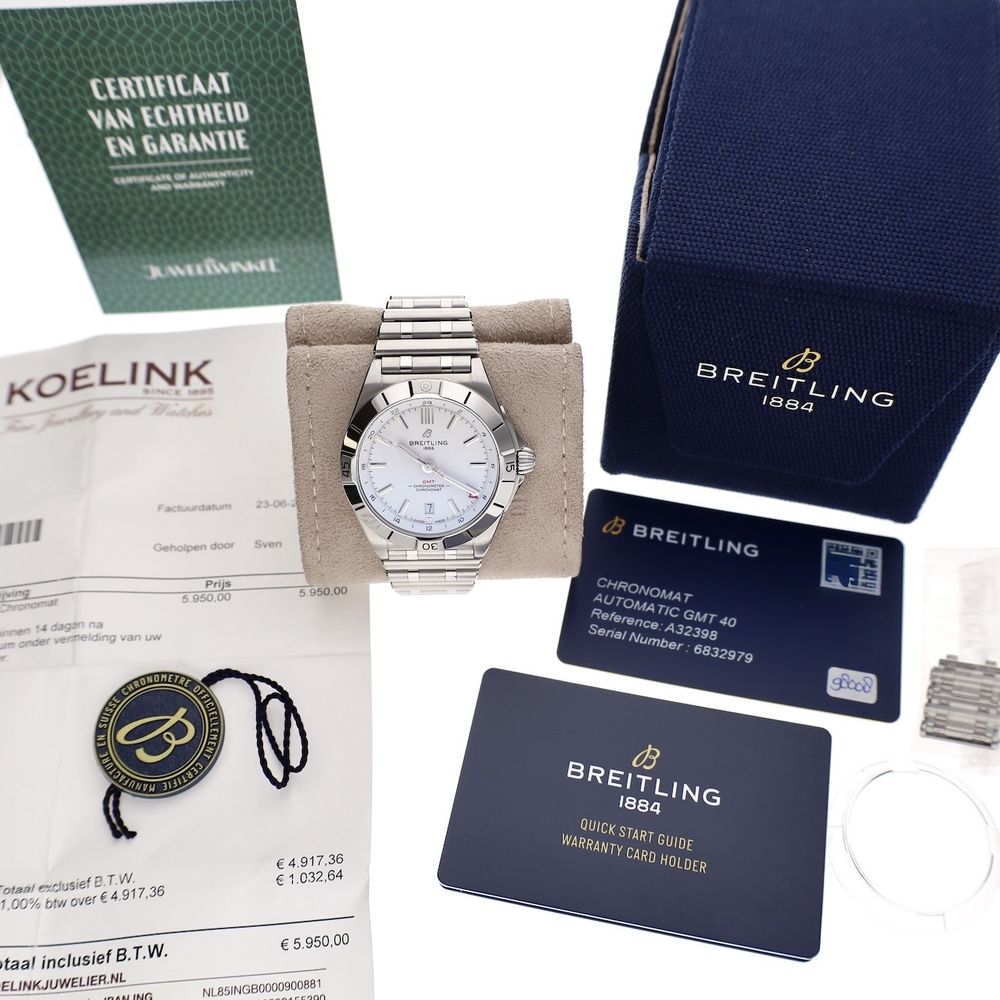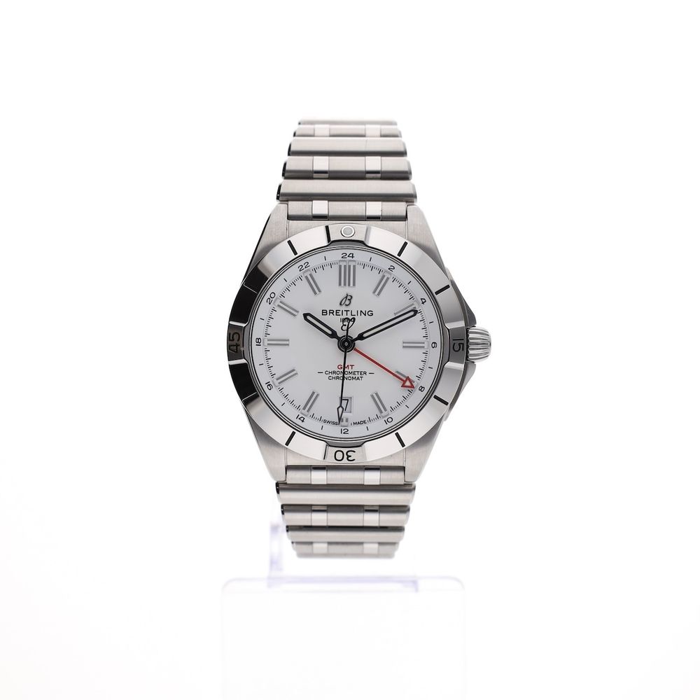 A stunning Breitling Chronomat GMT 40 with reference number A32398. A high-quality Swiss automatic men's watch. The Breitling Chronomat GMT 40 is the ideal watch for those who want to combine refined luxury with practical functionality. With its 40mm case diameter, automatic movement, and convenient GMT function (second time zone), this Breitling watch combines Swiss precision with versatile elegance. This watch from 2023 is in mint condition and comes as a beautiful full set including a Breitling warranty. The white dial provides a fresh, timeless look, while the red GMT hand immediately catches the eye and gives the watch a sporty touch. Thanks to the automatic movement and solid build quality, the Chronomat GMT 40 is not only a beautiful piece to wear but also a reliable watch at any time of day for almost any occasion. This watch comes as a full set including our in-house warranty report and 1.8 years remaining.