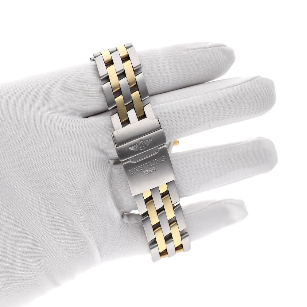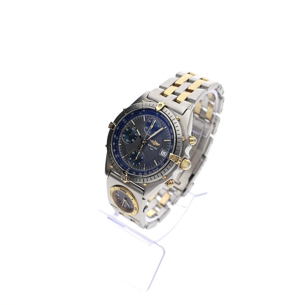 Top vintage! Breitling Chronomat chronograph with rare (and working) UTC module in the Breitling pilot's steel bracelet. A cool vintage Breitling. This watch is a nice, comfortable men's size with a diameter of 39mm. The Chronomat is the ultimate Breitling pilot's watch. Equipped with a very solid Swiss automatic chronograph movement. A great classic and a pure Breitling 'pilot's' tool as it was once intended! Furthermore, this watch is in very good condition. This watch comes on the original (and rare) steel Breitling gold/steel bracelet with links up to approximately 20cm wrists. The bracelet is also equipped with a Breitling UTC (second time zone/GMT) module with reference number B61172. What is striking is that the outer ring of the dial and the UTC dial show a beautiful patina/discoloration that gives it extra vintage character. As for the overall condition; certainly good, but also worn and typically vintage. The gold-plated crowns show some minor wear, but it's nothing to worry about. The movement in this watch is Breitling Cal. B13, a rock-solid automatic chronograph movement that runs perfectly and accurately. This watch comes with a vintage Breitling box, Breitling service papers from 2022 (neither pictured), and an in-house warranty report with a 1-year warranty.