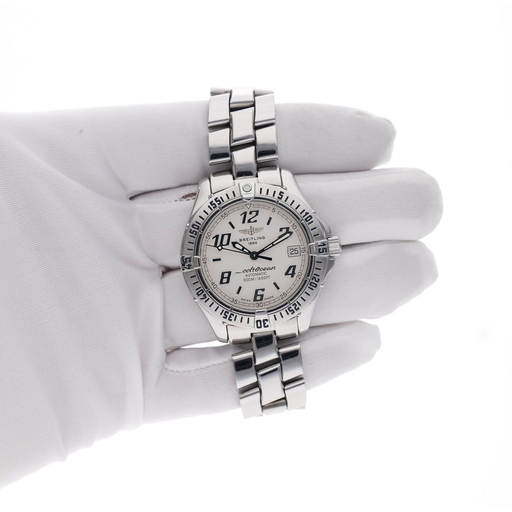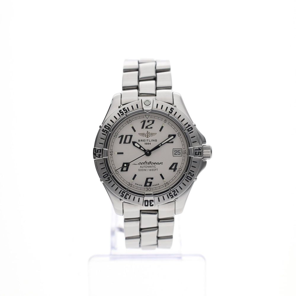 The Breitling Colt Automatic with reference number A17350 is a compact and robust classic from Breitling's sporty collection. The Colt series is known for its reliability, clear readability, and no-nonsense toolwatch character, features that make this model an excellent 'daily-beater'.
