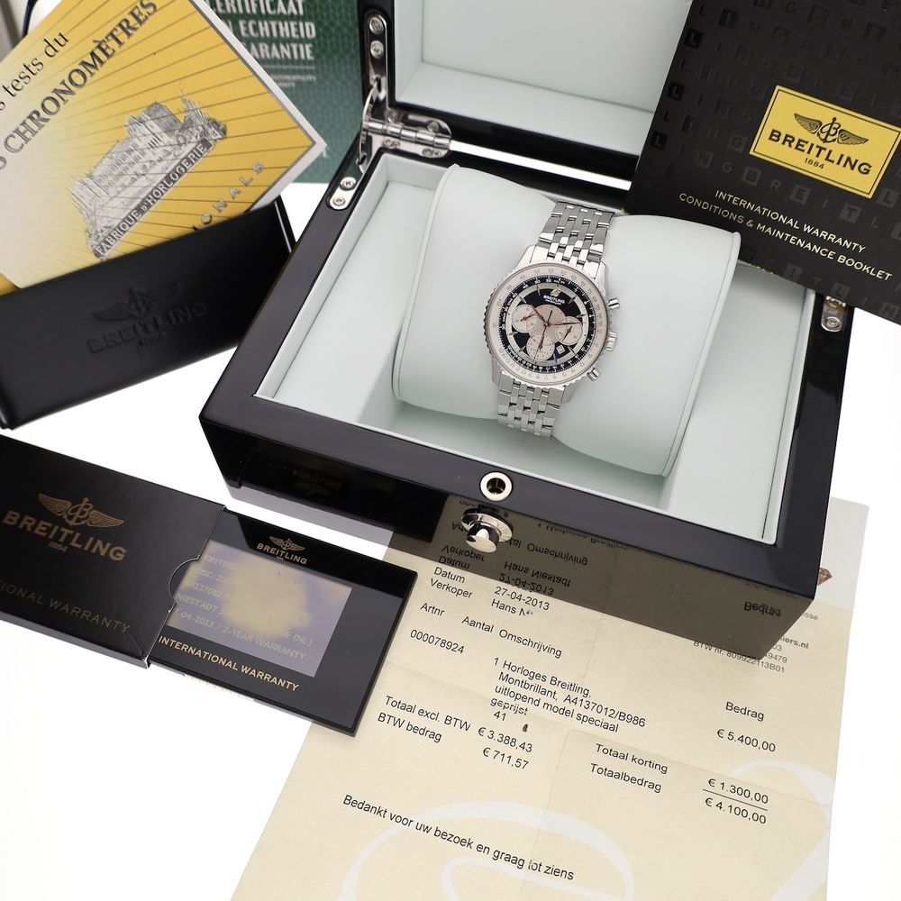 What a wonderful classic! The Breitling Montbrillant Chronograph with reference number A41370, classic craftsmanship with aviation roots. The Breitling Montbrillant A41370 pays tribute to Breitling's rich aviation heritage. With its characteristic "slide rule" bezel and classic chronograph layout, this automatic watch exudes nostalgia, precision, and style. The compact 38mm case makes it particularly suitable for those who appreciate a more subtle size without compromising appearance or functionality. Breitling's ultimate pilot's watch will always be the Navitimer. It's no wonder it's Breitling's longest-running model. We've included a special edition with numerous beautiful (and useful) complications and functions. With its 38mm case and beautifully detailed dial, it's easy to wear and definitely a striking eye-catcher. This watch is in good condition and comes as a beautiful full set from 2013. This watch has an automatic movement, Breitling Cal. B41 with a date display, chronograph, and Chronometer Certification. The movement runs very well and accurately. Regarding the strap: An original Breitling Pilot 7-Row steel bracelet. A very refined and comfortable strap. The strap fits links up to approximately 19cm wrists and can, of course, be custom-made/delivered. A true Breitling in very beautiful condition and complete with a Breitling service box, a luxury in-house box, a digital Breitling warranty card (not entirely legible, but that's common), a COSC Chronometer certificate, a manual, slider ruler instructions, and an in-house warranty report with a 1-year warranty.