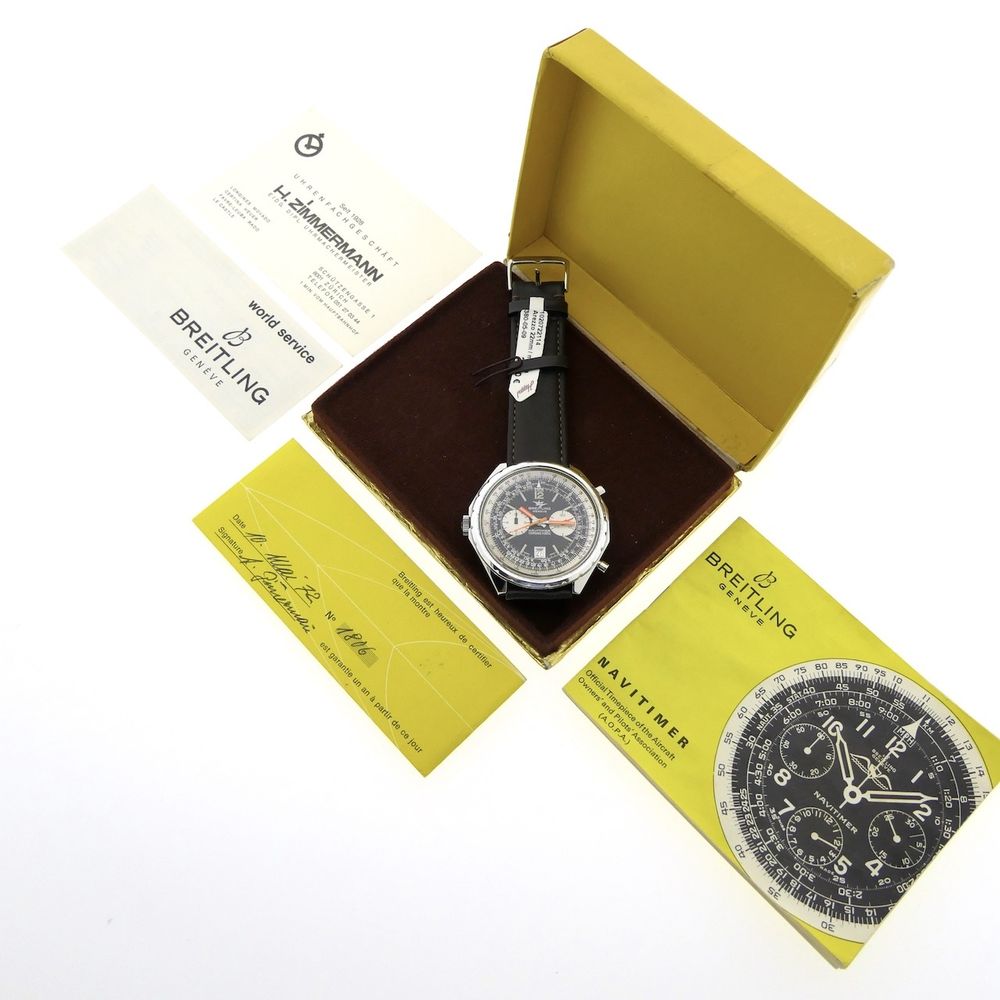 Beautiful and rare Breitling Navitimer Chrono-Matic 1806. Not only a collector's must-have with a wonderful history, but above all a pilot's watch from the early 70s—according to the included paperwork, May 10, 1972, to be precise. This analog measuring instrument was often supplied to pilots and air forces in the 60s and 70s, even before the existence of digital measuring instruments in aircraft. The integrated "slide ruler" (or mechanical slide rule) allowed for quick calculations of fuel, climb/descent timing, flight duration, and other flight times during flights. Excellent vintage, in original and certainly worn condition. The aluminum bezel, which should be black, is slightly discolored and has been tarnished (a common phenomenon) and is fixed (does not rotate). The caseback is still quite legible in the right light (the brand/serial number and, of course, correspond with the paperwork) but is also somewhat faded. The dial and hands are clean, neat, and original. We've adjusted the price based on the condition and scope of delivery. This was a huge watch for its time, measuring approximately 48mm, and clearly more of an instrument than an everyday timepiece. Moreover, the short lugs make it exceptionally wearable, even on smaller wrists. The Valjoux cal. 11 "microrotor" automatic movement is signed on the bridge with "Breitling watch ltd." and runs perfectly. It winds smoothly, and the chronograph function works properly. The amplitude and accuracy of this watch are excellent, meeting current strict COSC standards. This movement is known for being very robust and easy to use, and parts are readily available, as well as specialists who can repair/maintain it. This watch came on a custom-made steel bracelet that fits perfectly and is included. For the sake of beauty, we've replaced this bracelet with a beautiful, matching new, high-quality leather strap. As mentioned, this beautiful timepiece, including the original papers and Breitling box, dates from the 1970s. A fantastic vintage classic and pure Breitling as it was once intended... But then in a rare full set with a 1-year warranty.