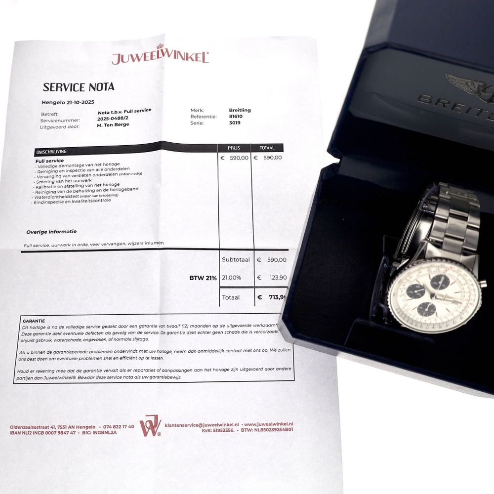 The watch comes as a rare full set, including: Vintage Breitling box, Breitling warranty papers, Breitling booklet, service papers, and our warranty report with 1 year warranty.