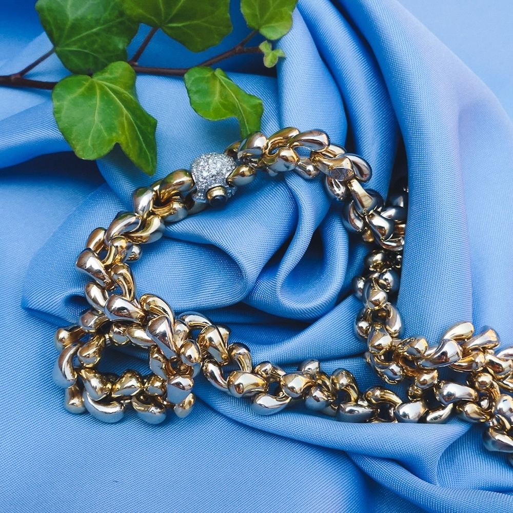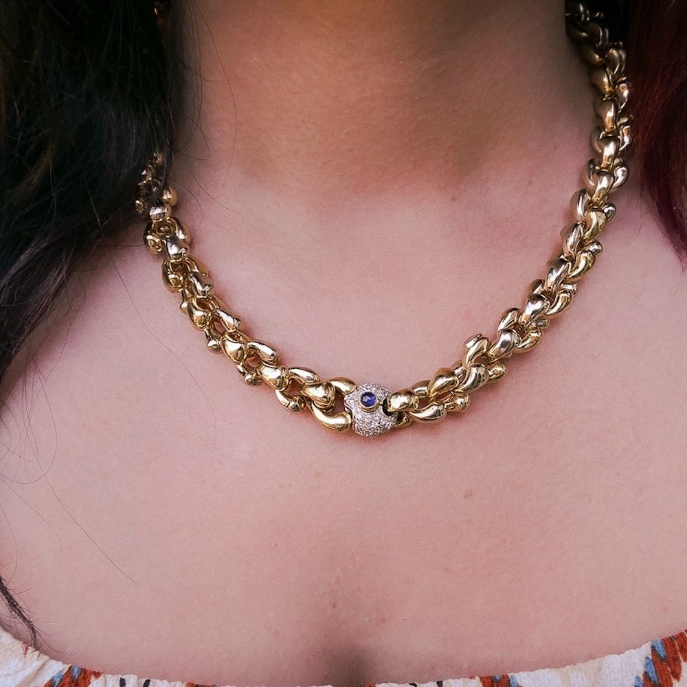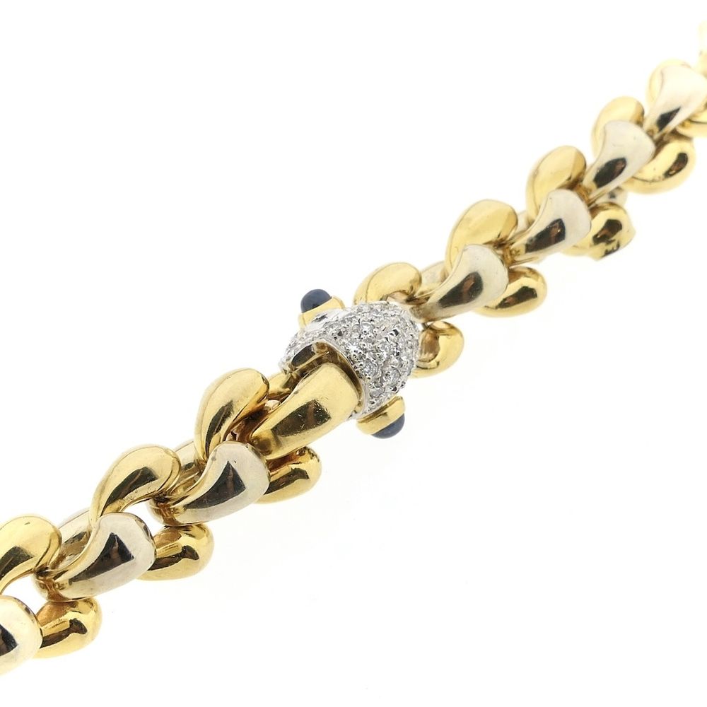 Two-tone gold fantasy link necklace. The links are alternately white and yellow gold, with a beautiful clasp at the end. It is set with a total of 0.96 ct. diamonds and two cabochon-cut sapphires. One of the sapphires can be pulled out and secured by turning, after which you can click the other end into place. Finally, you can unscrew the sapphire and it locks into place. It is a supple piece of jewelry with a robust and luxurious appearance. The bracelet is crafted from 18-karat yellow gold (750/1000). Cadaro combines traditional craftsmanship with contemporary innovation. In their workshops, specialized artisans work with the most refined techniques on jewelry that excels in quality and detail. Driven by a passion for beauty, Cadaro creates timeless jewelry with an elegant and unique look.