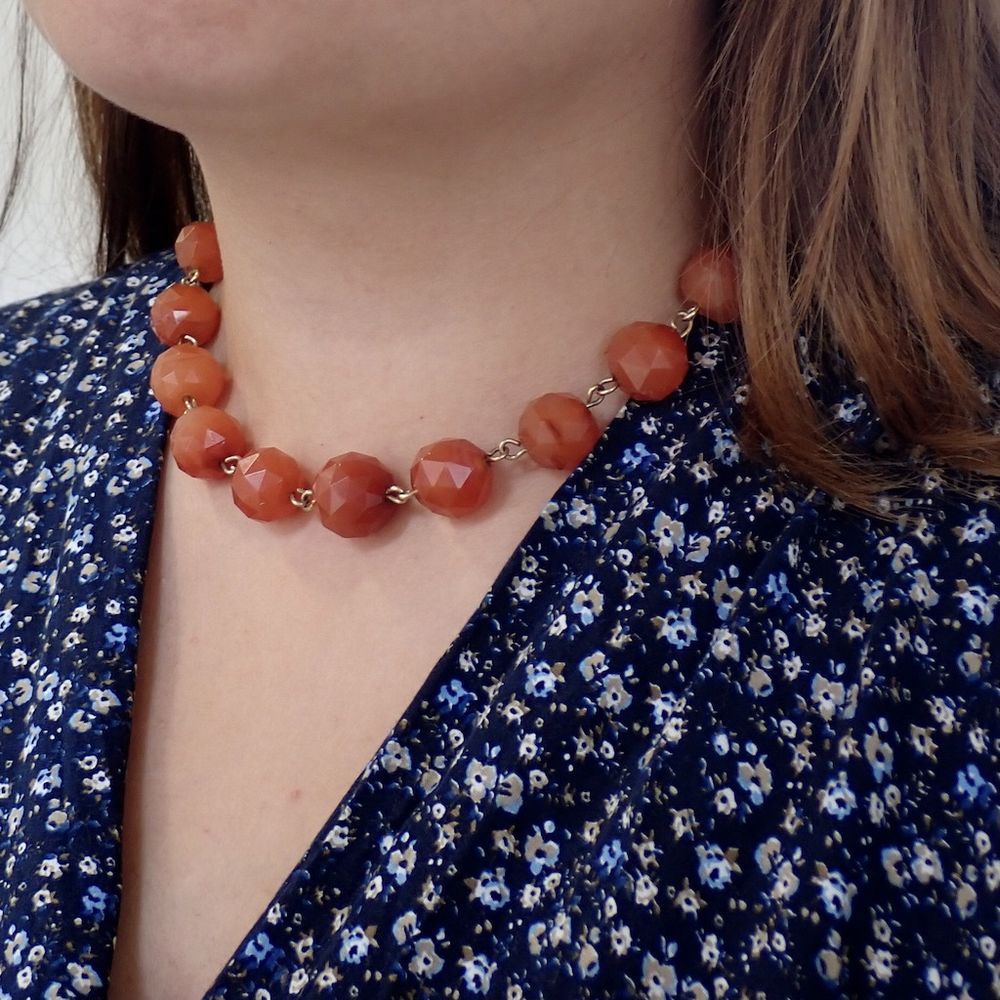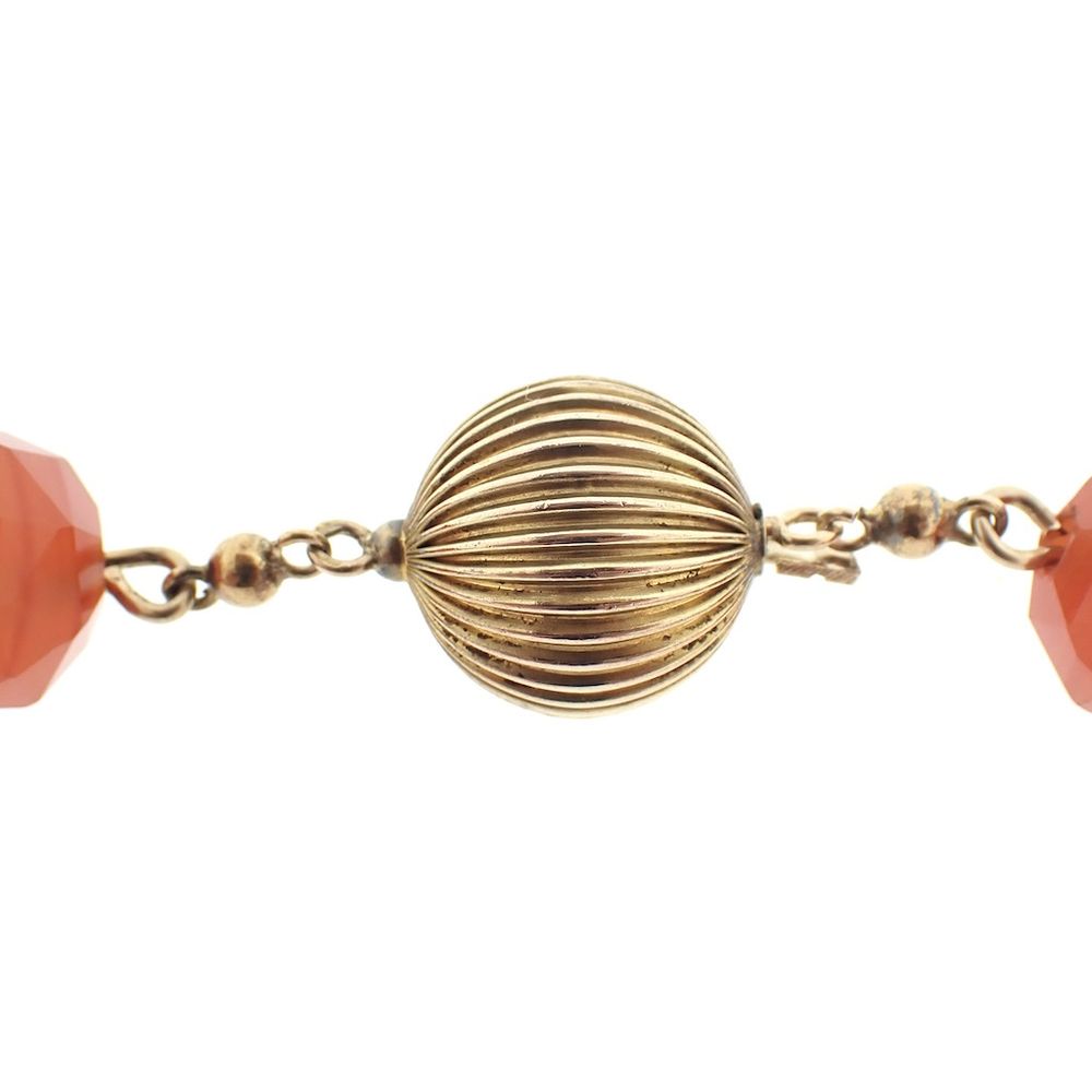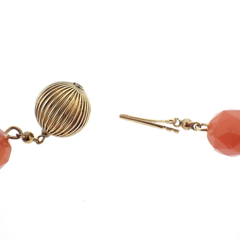 Gold necklace strung with red/orange carnelian beads. The beads are attached to gold pins. The necklace closes with a decorative clasp and is crafted from 14-karat yellow gold (585/1000).
