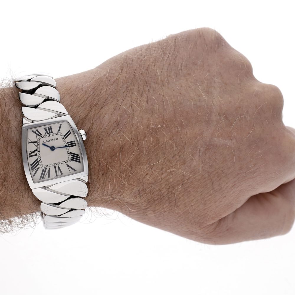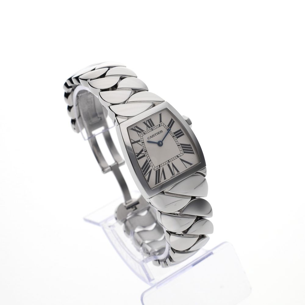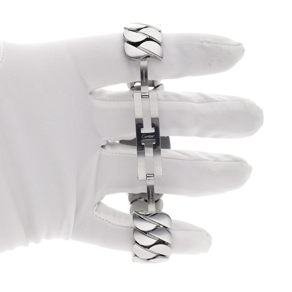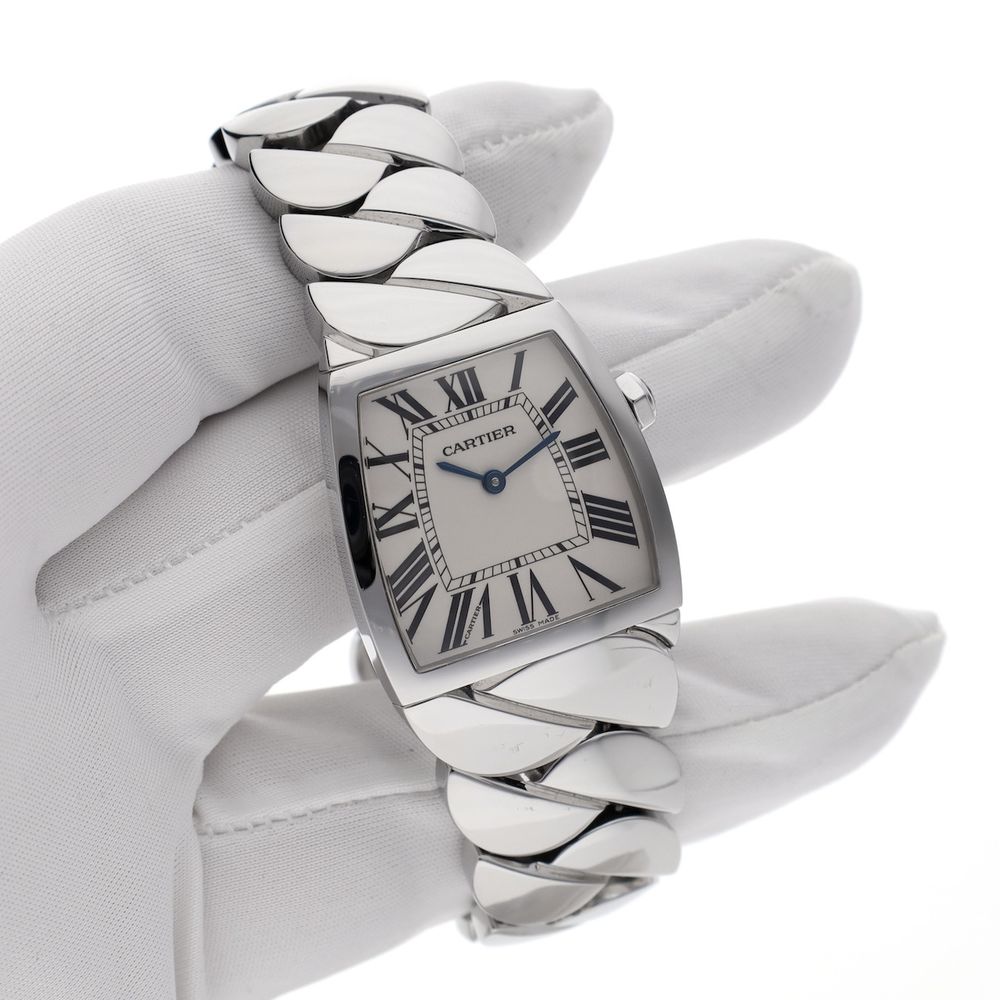 Rare Cartier La Dona de Cartier with reference number W6600221. This is a timeless statement of style! Elegant, striking, and unmistakably Cartier. The La Dona de Cartier Large W6600221 is a powerful timepiece that exudes luxury down to the smallest detail. Inspired by the iconic Mexican film star María Félix, a woman known for her style and boldness, this timepiece is designed for those who dare to stand out. Why this watch is special: Rare appearance: This model is no longer in production, and pre-owned examples in this condition are scarce. Characterful design: The trapezoidal case and luxurious link bracelet make this watch a graceful statement. Fully inspected: Extensively checked for authenticity, functioning, and condition. A powerful gift – or a treat for yourself: the La Dona de Cartier is not a watch that keeps still. It is a sign of confidence, style, and timeless class. Perfect as a luxury gift or as an investment in a pre-owned watch that retains its value. This watch is in excellent condition and comes as a full set from 2007. It's a very comfortable watch, originally designed for women (it wears like a round 34mm watch), but thanks to the integrated dial and solid bracelet, it's also a style icon for men. Regarding the movement, it's a high-quality Swiss-made quartz movement. The movement runs perfectly and has a new battery. This watch comes on an integrated steel Cartier bracelet with a folding clasp, and all links in the bracelet fit wrists up to approximately 18.5cm. The bracelet is also in excellent condition, as is the watch itself. This watch comes with a Cartier box, Cartier manual/folding case/warranty papers/DVD, and a warranty report with a 1-year warranty.