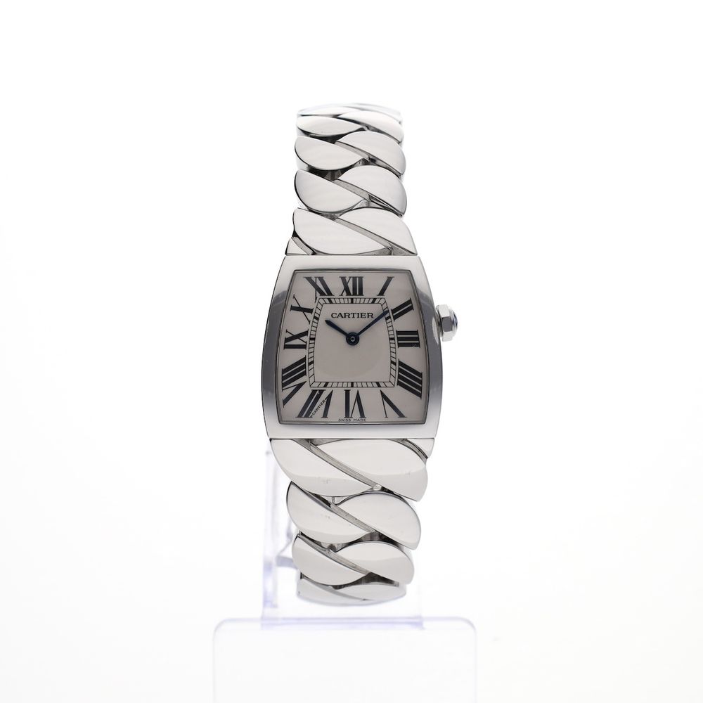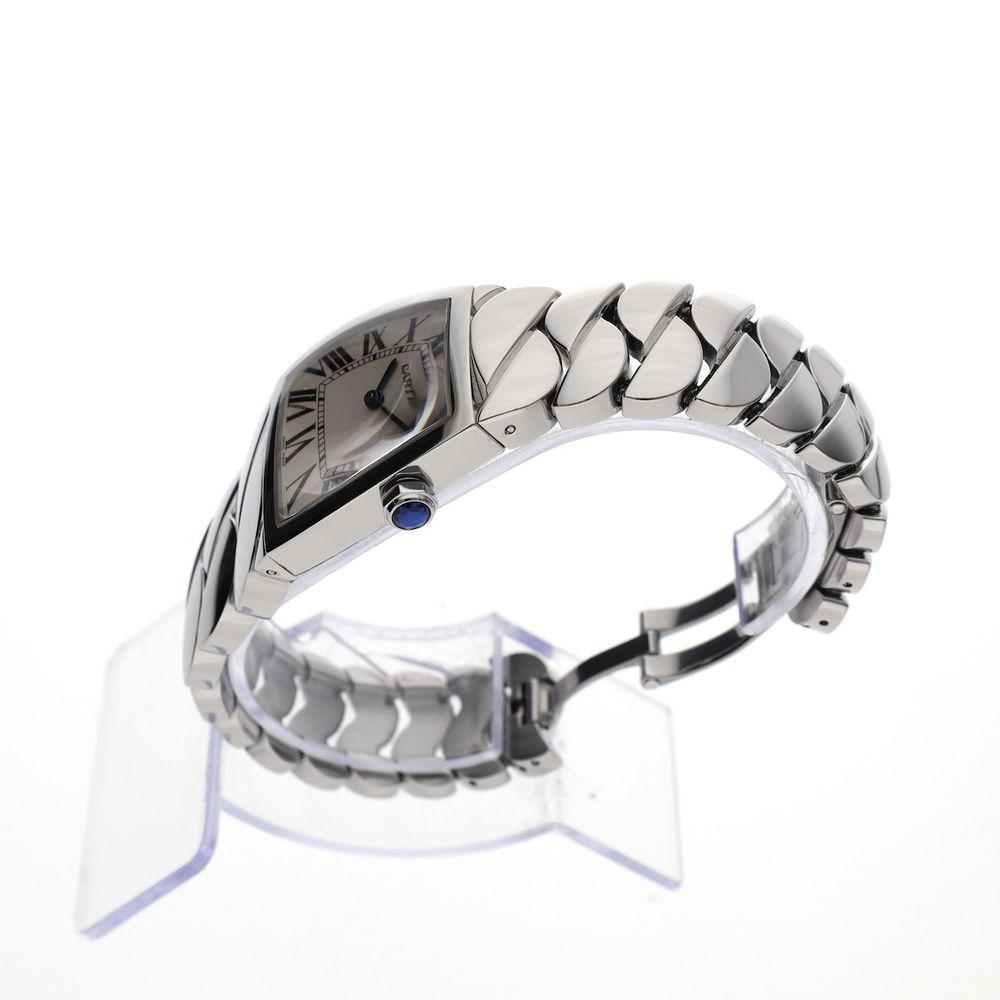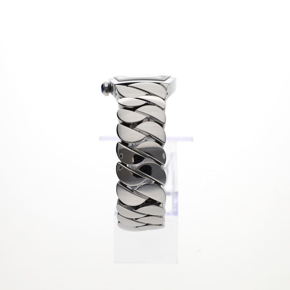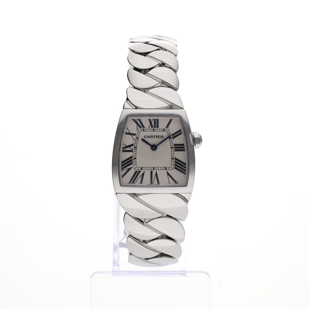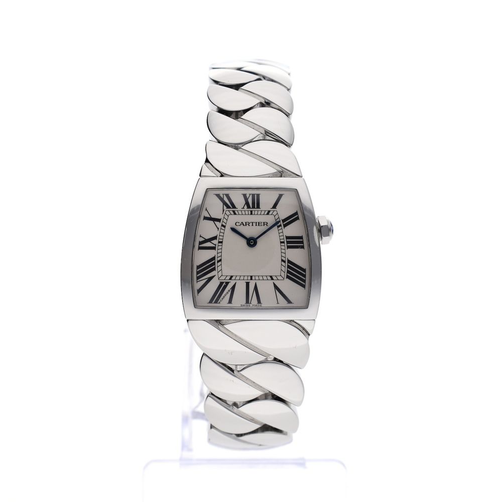 Rare Cartier La Dona de Cartier with reference number W6600221. This is a timeless statement of style! Elegant, striking, and unmistakably Cartier. The La Dona de Cartier Large W6600221 is a powerful timepiece that exudes luxury down to the smallest detail. Inspired by the iconic Mexican film star María Félix, a woman known for her style and boldness, this timepiece is designed for those who dare to stand out. Why this watch is special: Rare appearance: This model is no longer in production, and pre-owned examples in this condition are scarce. Characterful design: The trapezoidal case and luxurious link bracelet make this watch a graceful statement. Fully inspected: Extensively checked for authenticity, functioning, and condition. A powerful gift – or a treat for yourself: the La Dona de Cartier is not a watch that keeps still. It is a sign of confidence, style, and timeless class. Perfect as a luxury gift or as an investment in a pre-owned watch that retains its value. This watch is in excellent condition and comes as a full set from 2007. It's a very comfortable watch, originally designed for women (it wears like a round 34mm watch), but thanks to the integrated dial and solid bracelet, it's also a style icon for men. Regarding the movement, it's a high-quality Swiss-made quartz movement. The movement runs perfectly and has a new battery. This watch comes on an integrated steel Cartier bracelet with a folding clasp, and all links in the bracelet fit wrists up to approximately 18.5cm. The bracelet is also in excellent condition, as is the watch itself. This watch comes with a Cartier box, Cartier manual/folding case/warranty papers/DVD, and a warranty report with a 1-year warranty.